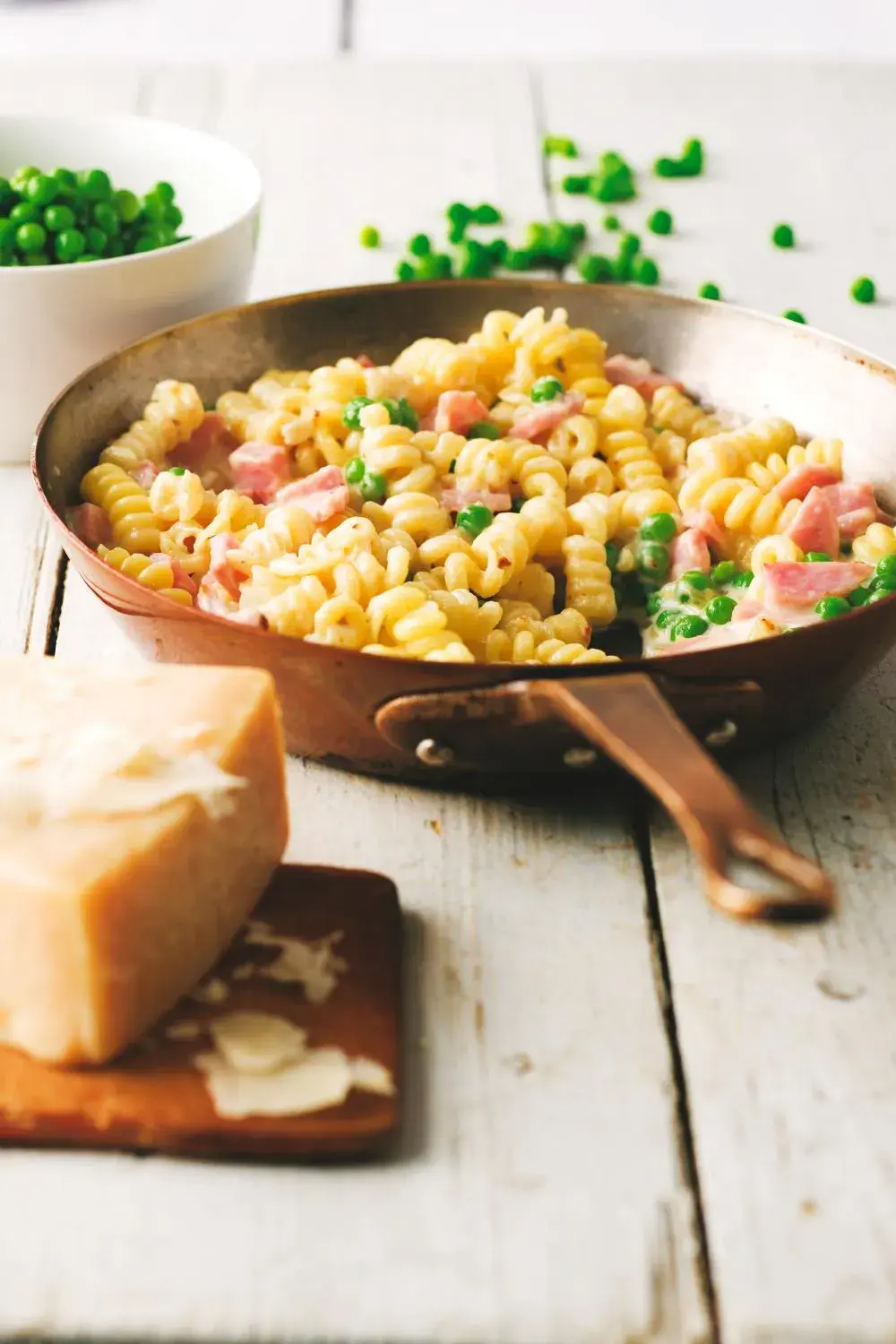 Na 2 lžících másla opékejte 3 minuty malou cibuli nadrobno a 100 g šunky na kostičky. Poprašte lžičkou hladké mouky, rozmíchejte a zalijte 250 ml 30% smetany. Přiveďte k varu a po 2 minutách přidejte 200 g mraženého hrášku, sůl, pepř a vařte další 3 minuty. Vmíchejte fusilli; podávejte s parmazánem.