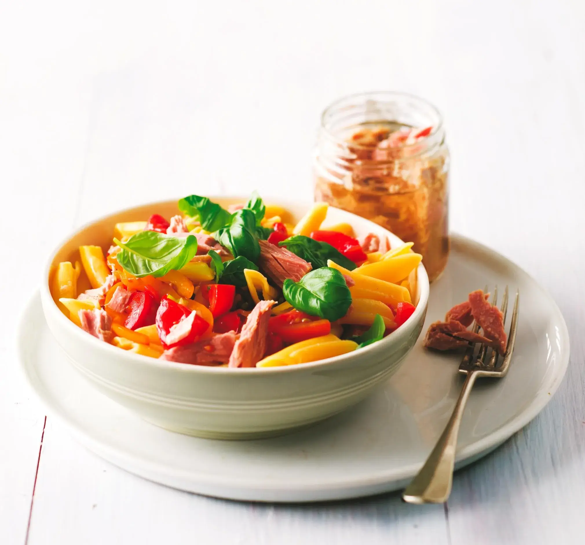 Na 2 lžících oleje zpěňte nasekanou jarní cibulku, přihoďte proužky žlutých a červených paprik (celkem 350 g) a opékejte 3 minuty. Přidejte 200 g rajčat, na kostky, špetku chilli, sůl a vařte 20 minut. Smíchejte se 150 g tuňáka z konzervy, s uvařenými penne a bazalkou.