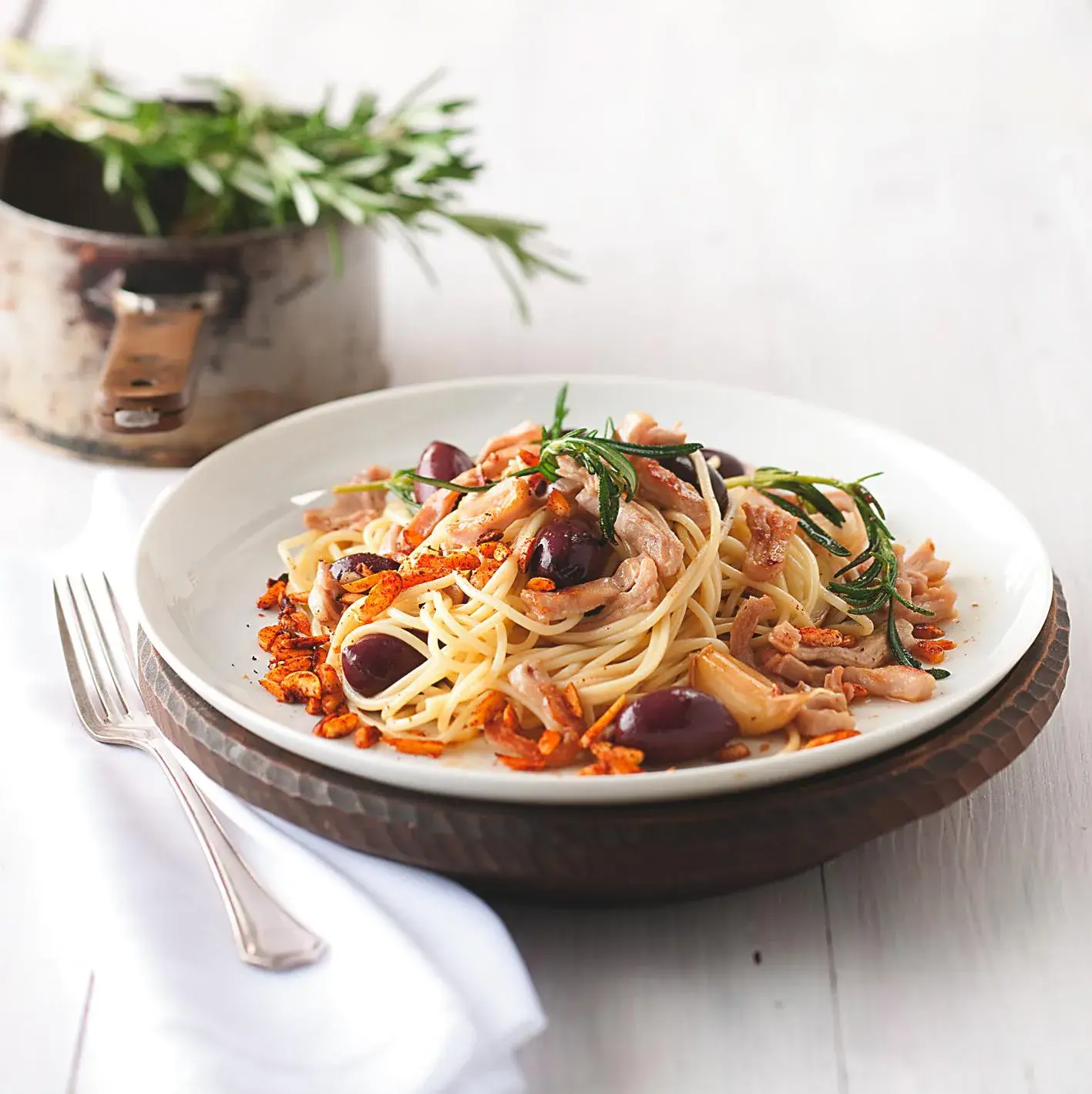 Na 4 lžících olivového oleje opékejte asi 4 minuty 4 neoloupané stroužky česneku a 300 g králičího hřbetu nakrájeného na nudličky a osoleného. Zalijte 100 ml bílého vína, ztlumte a přiklopené duste 20 minut. Přidejte 80 g oliv kalamata (černohnědé), nasekané lístky z jedné snítky rozmarýnu a ještě 3 minuty duste. Na lžíci oleje opražte dozlatova 50 g loupaných, na nudličky nasekaných mandlí poprášených mletou pálivou paprikou. Špagety promíchejte s ragú a ozdobte mandlemi.