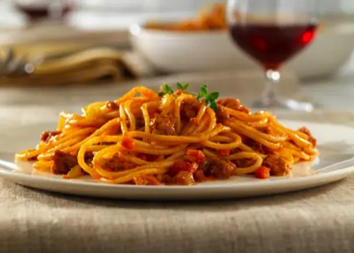 - Uvařené špagety sceďte a přidejte je do pánve s ragú. Jemně vše na mírném ohni proházejte (promíchejte), aby se špagety důkladně omáčkou obalily.