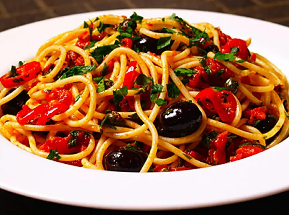 - Přidejte kapary, chilli papričky a olivy; vařte další 2 minuty.