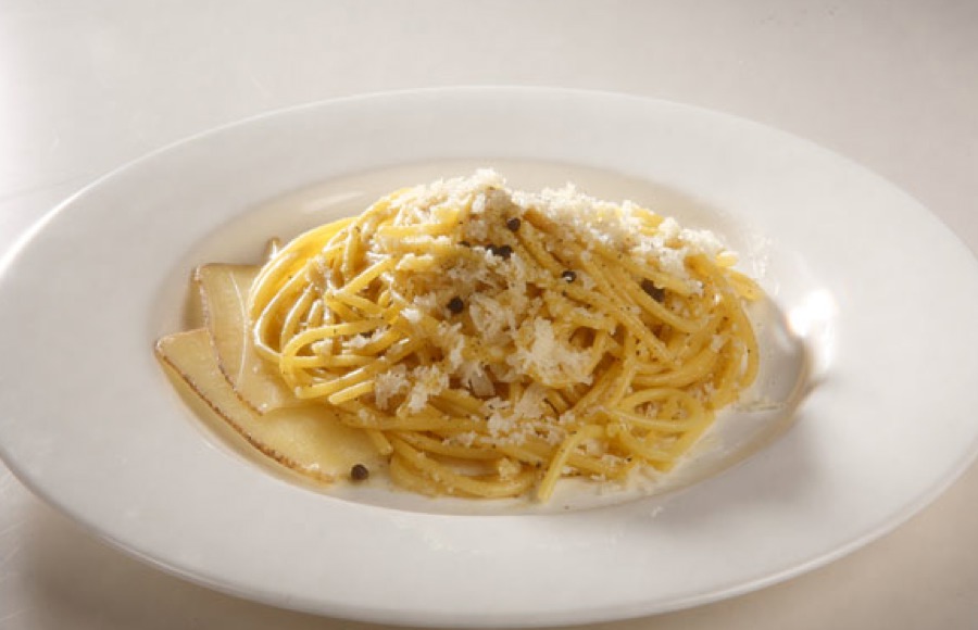 - Když jsou uvařené al dente, špagety sceďte a dejte do teplé servírovací mísy. Posypejte nastrouhaným sýrem a drceným pepřem. Zakápněte pár lžičkami vody, ve které se špagety vařily, aby se omáčka dobře rozpustila a sloučila.