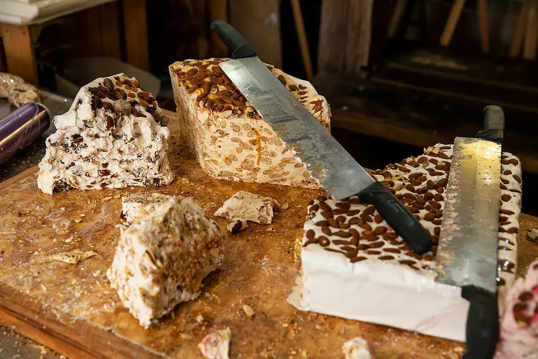 - Bílý nugát se vyrábí z našlehaných vaječných bílků, mandlí, medu i cukru a připomíná turecký med.