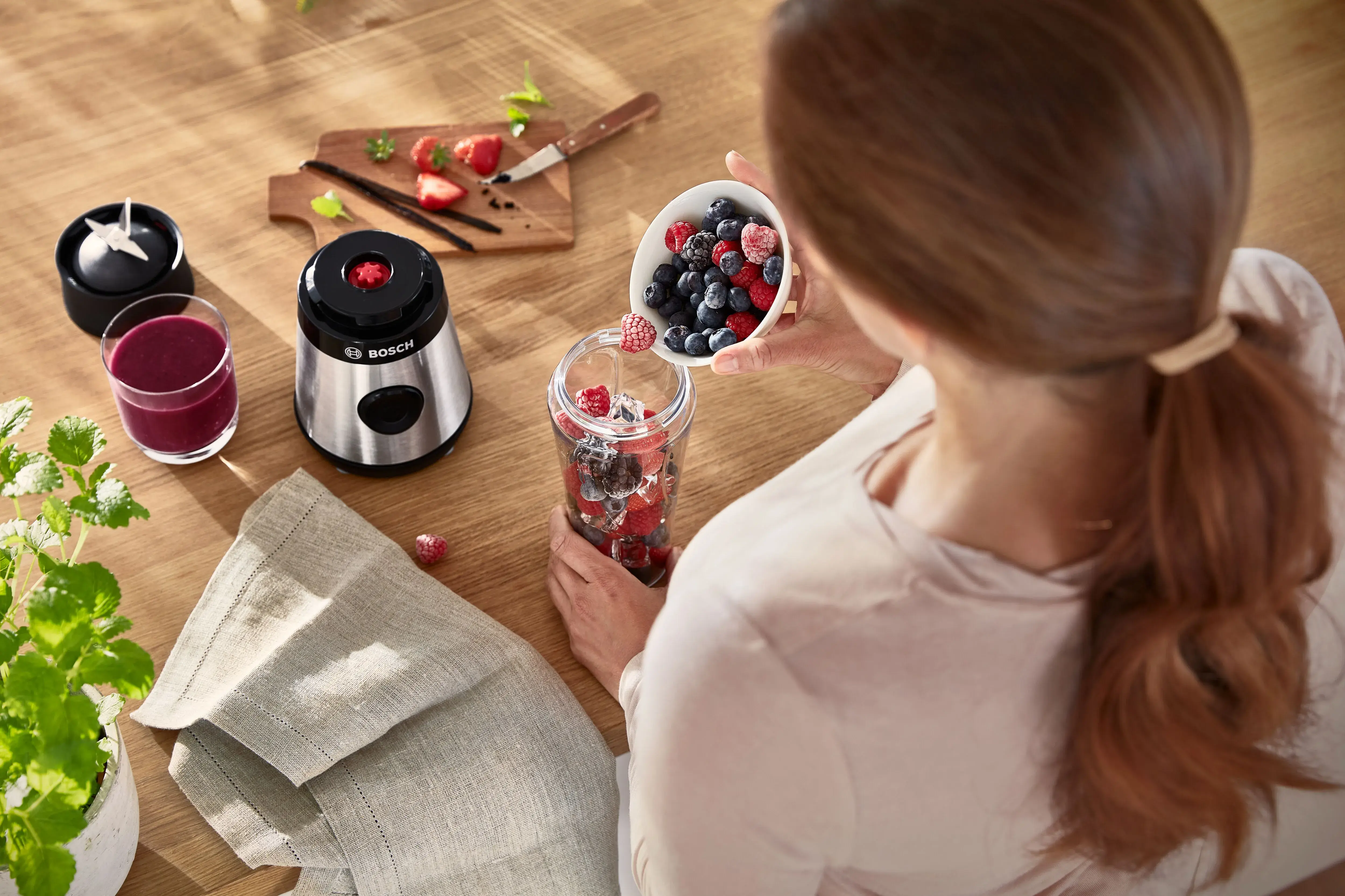 Ranní dávka vitaminů, svačina před další schůzkou nebo okamžitá vzpruha po tréninku. To všechno je smoothie. Ať už máte po ruce ovoce čerstvé, nebo mražené, s mixérem Bosch VitaPower Serie 2 připravíte dokonalé smoothie za všech okolností — pouhým stisknutím tlačítka — a rovnou do lahve.