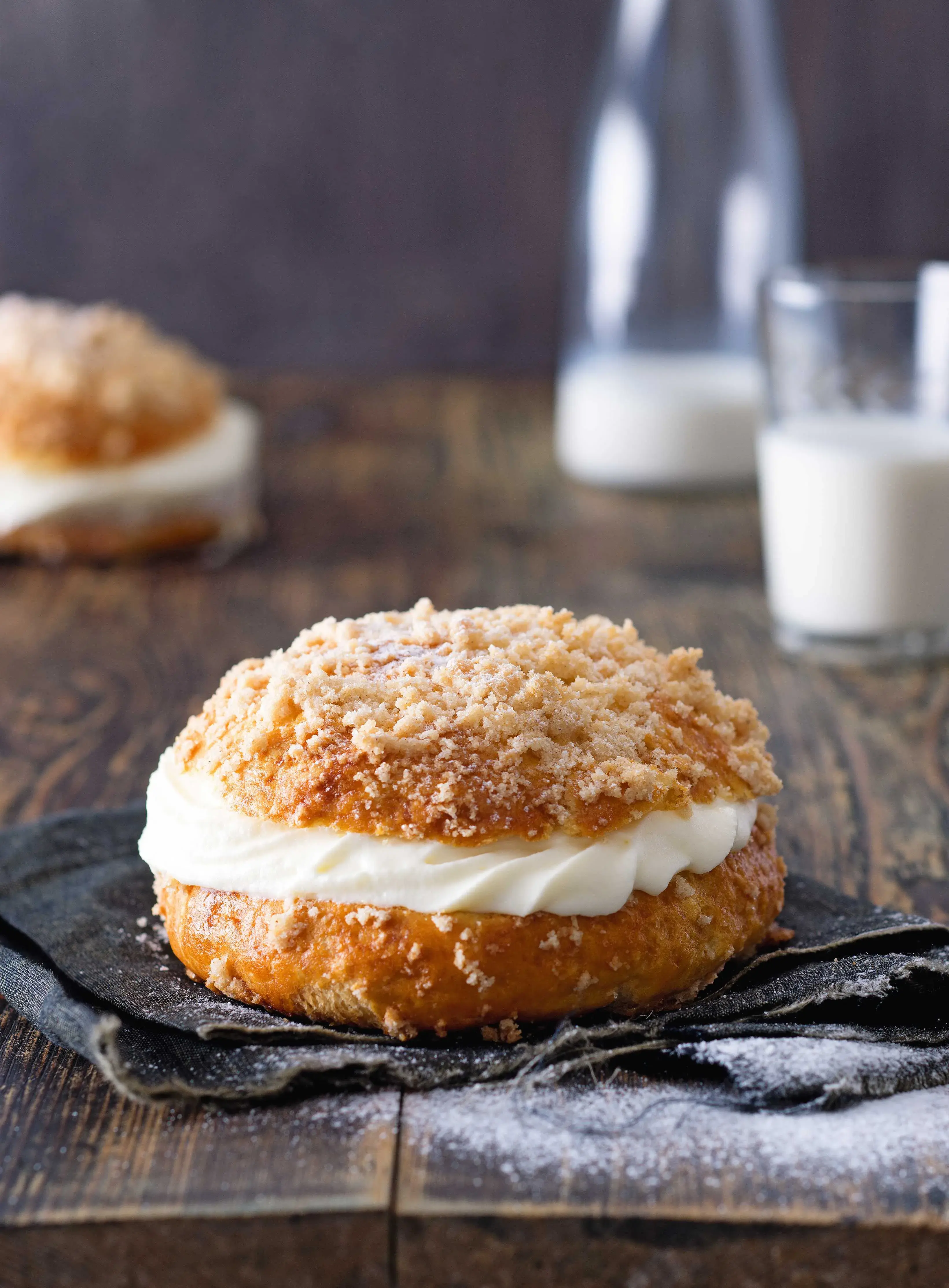 - Vylepšenou briošku po upečení rozpůlil a naplnil směsí vanilkového a citronového krému.