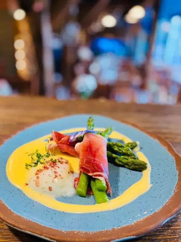 Chřest s holandskou omáčkou, parmskou šunkou a pošírovaným vajíčkem