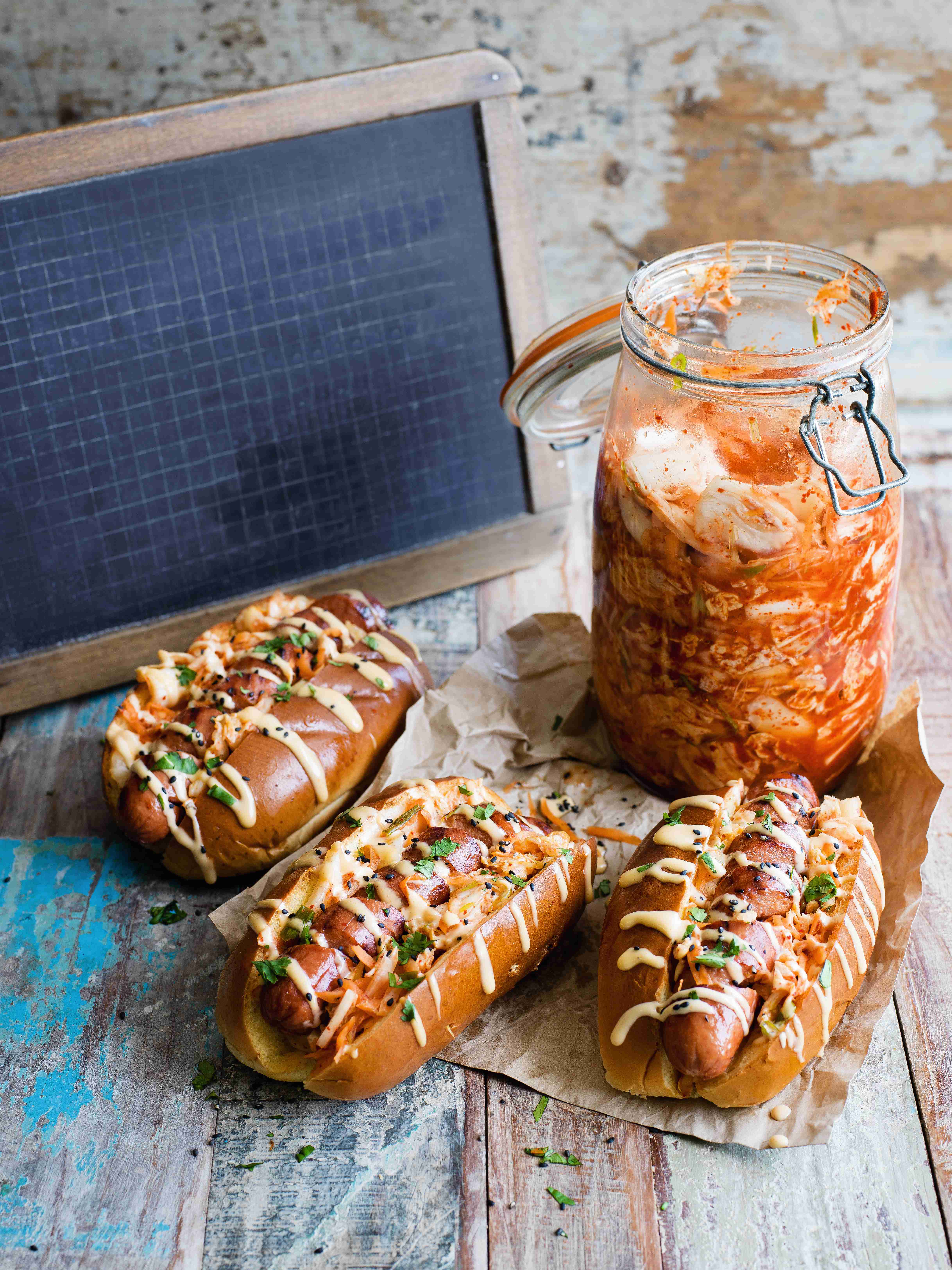 Kimči se hodí skoro ke všemu: burgery, hotdogy, sendviče... Párek grilovaný do zlatova, podávaný v opečené žemli s pikantním kimči, sriracha majonézou, koriandrem a sezamem potěší všechny milovníky pálivého.