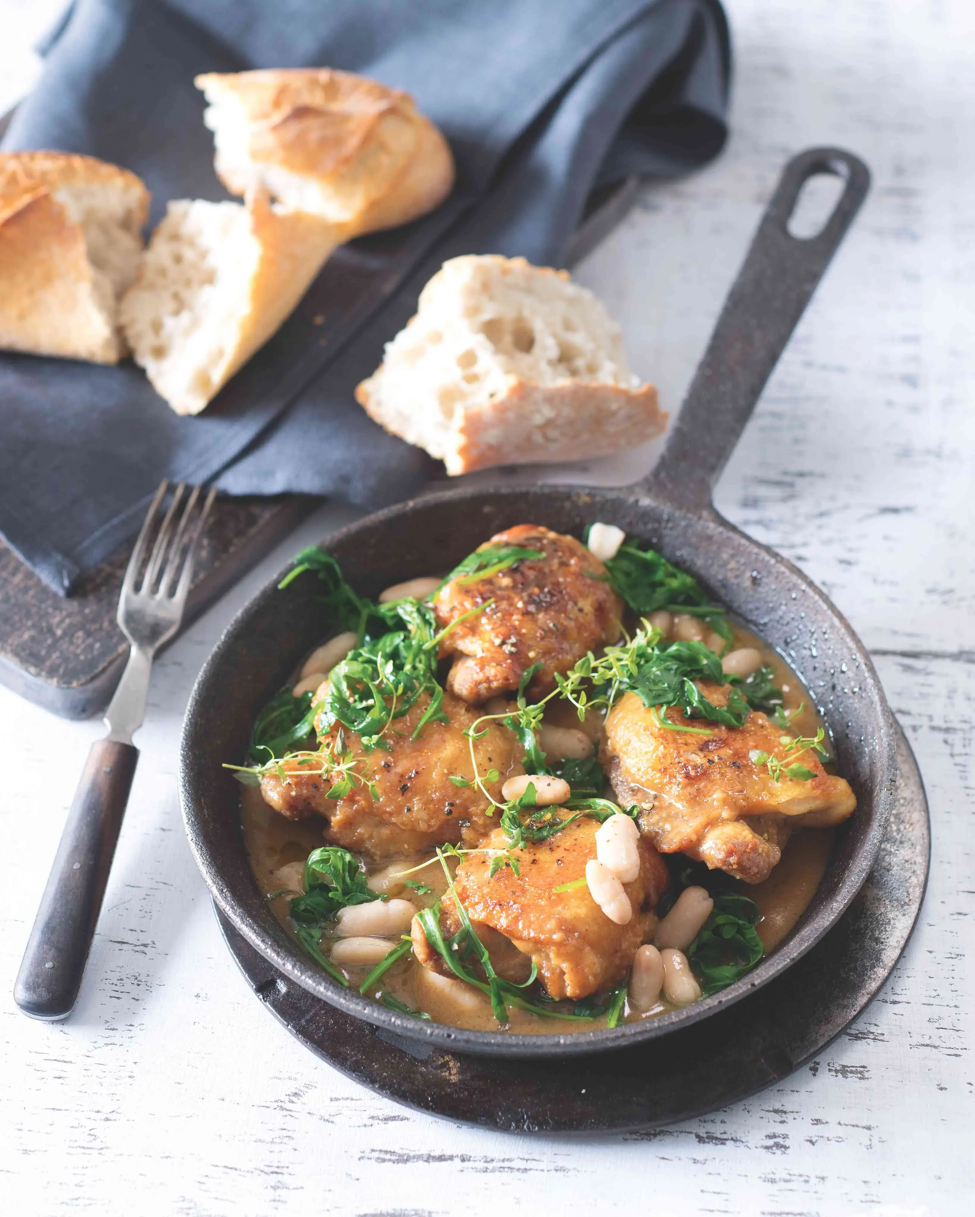 Tip: Jestli chcete mít kuře s křupavou kůrčičkou, dejte pánev po přidání fazolí na pár minut do trouby pod gril, aby pěkně zezlátlo. Potom ho vyjměte, vmíchejte rukolu a nechte ji pod pokličkou chviličku zavadnout.