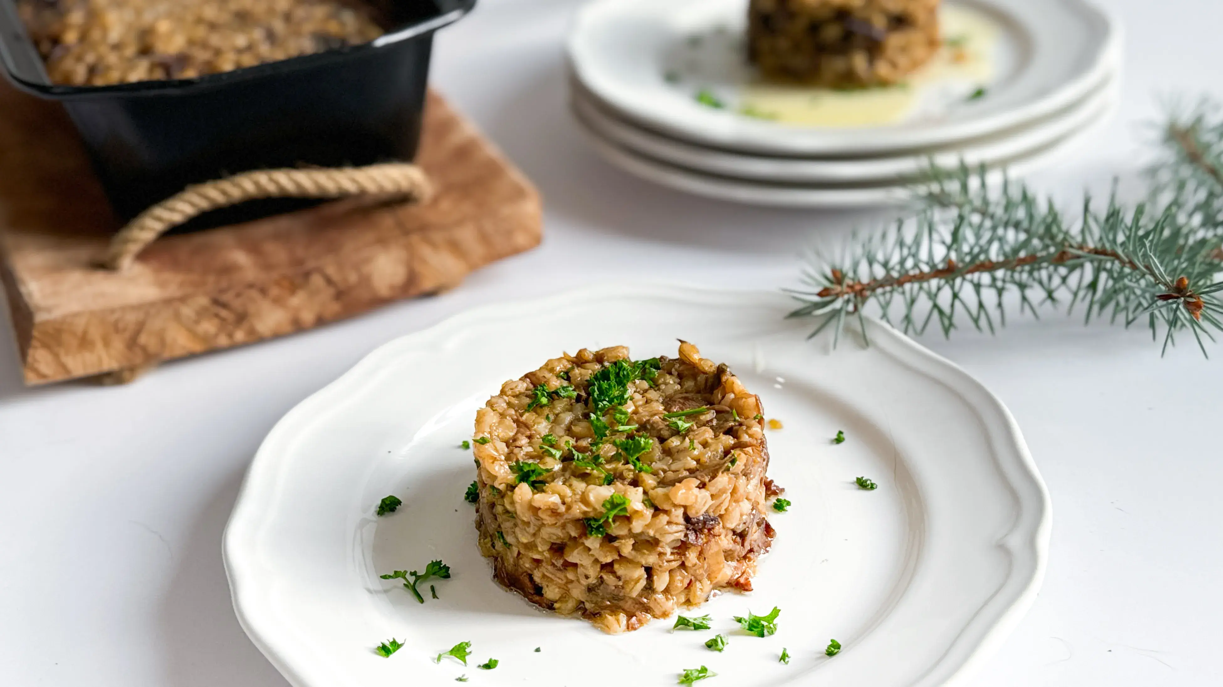 - Houbovou směs smíchejte s kroupami a přidejte majoránku. Pekáč vymažte sádlem a naplňte směsí. Navrch položte plátky másla. Pečte přibližně 20 minut na 180 °C, až se vytvoří křupavý povrch.