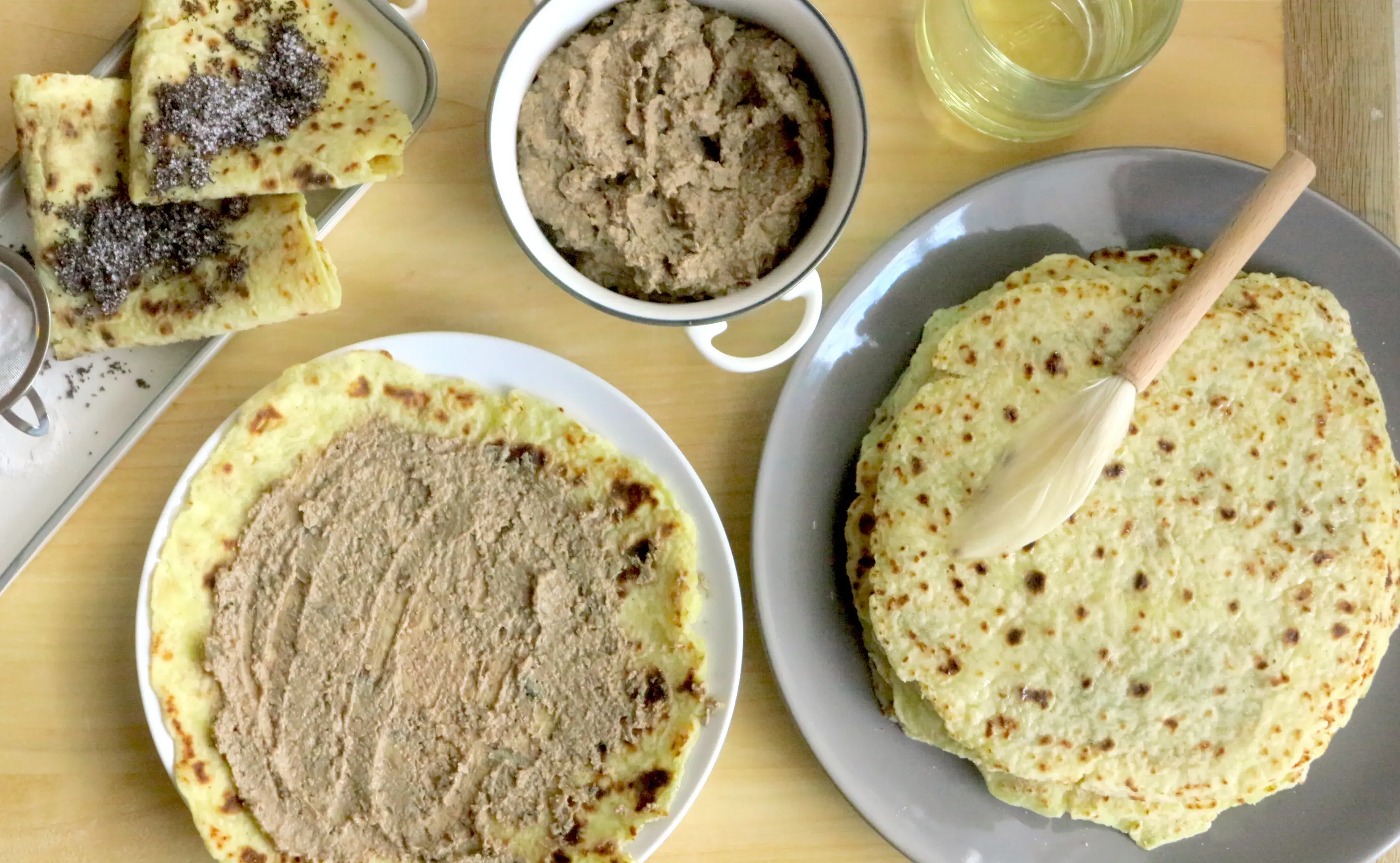 - Opečenou placku přeneste na talíř, potřete rozpuštěným sádlem a můžete se pustit do další.
