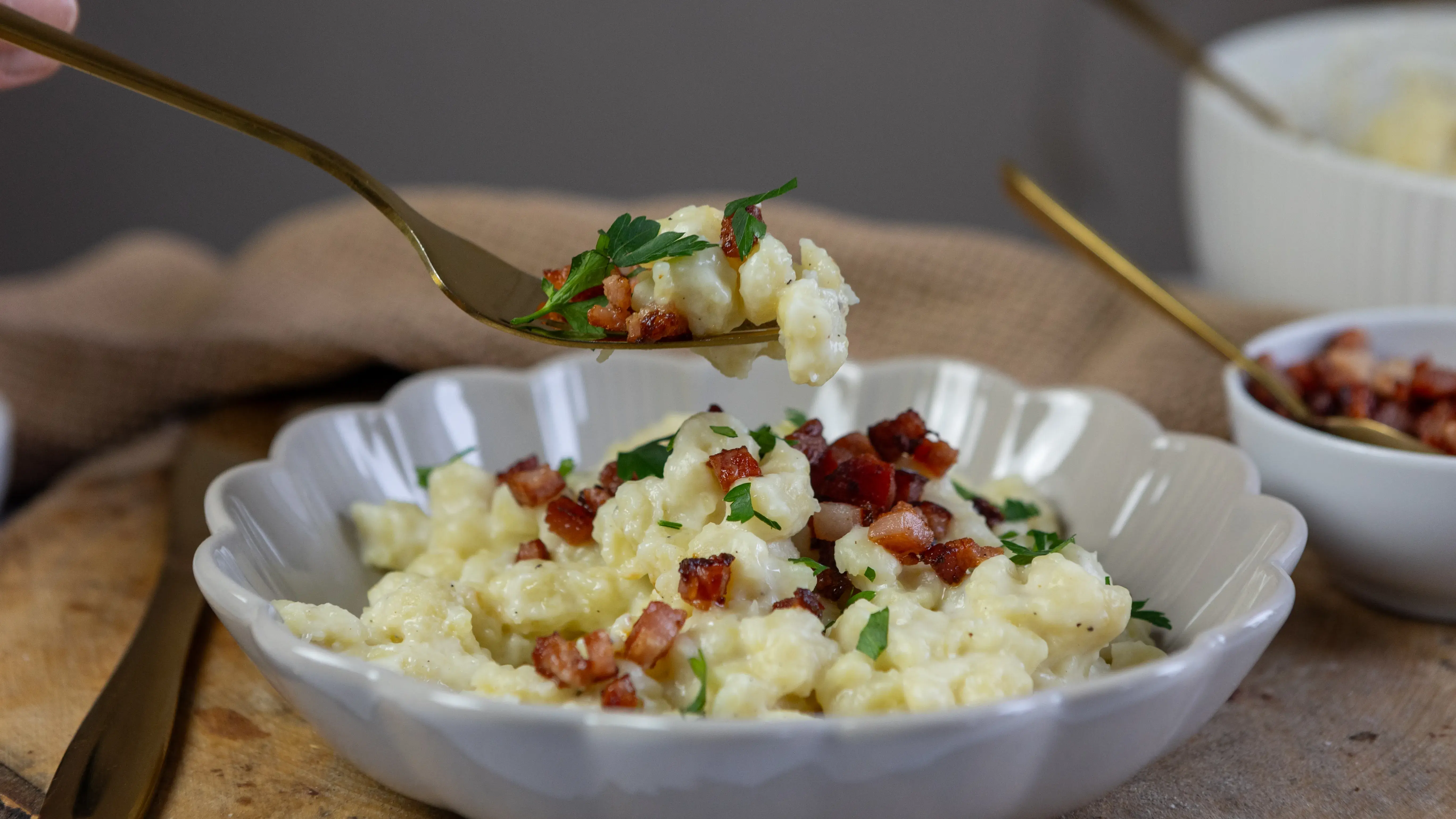 Ingredience pro 4 porce: 750 g brambor, 250 g pšeničné polohrubé mouky, sůl, pepř, 1 vejce, 150 g slaniny, 200 g brynzy, 100 ml smetany ke šlehání, 1 hrst nasekané petrželky