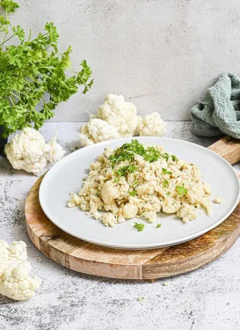 Přidejte povařený a nasekaný květák a chvíli restujte. Nakonec vmíchejte rozšlehaná vejce a nechte je za stálého promíchávání ztuhnout. Osolte, opepřete a podávejte sypané petrželkou nebo sekanou pažitkou.