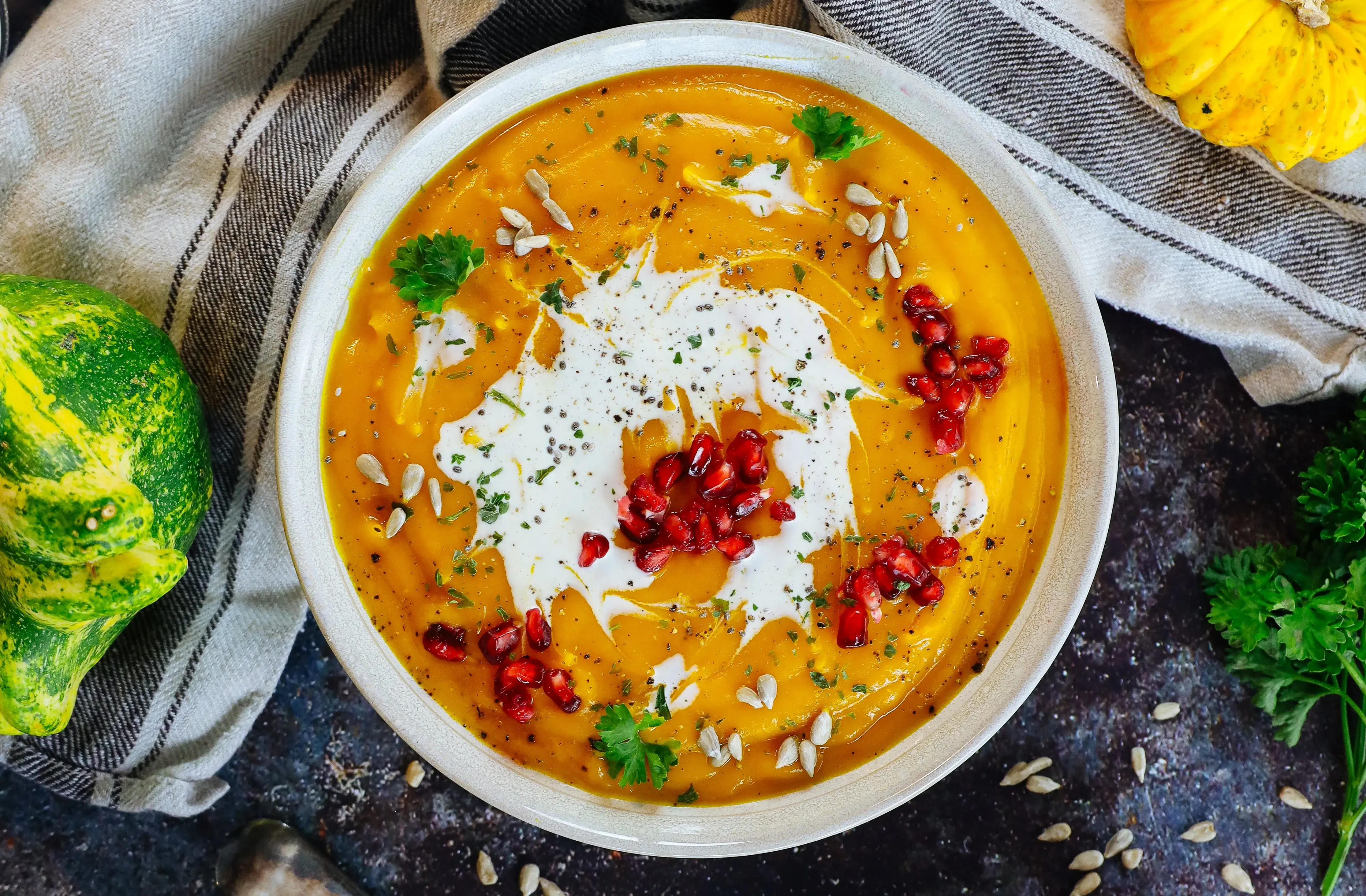 Polévku můžete servírovat se lžící zakysané smetany, pokapanou olivovým či dýňovým olejem a posypat praženými dýňovými semínky.