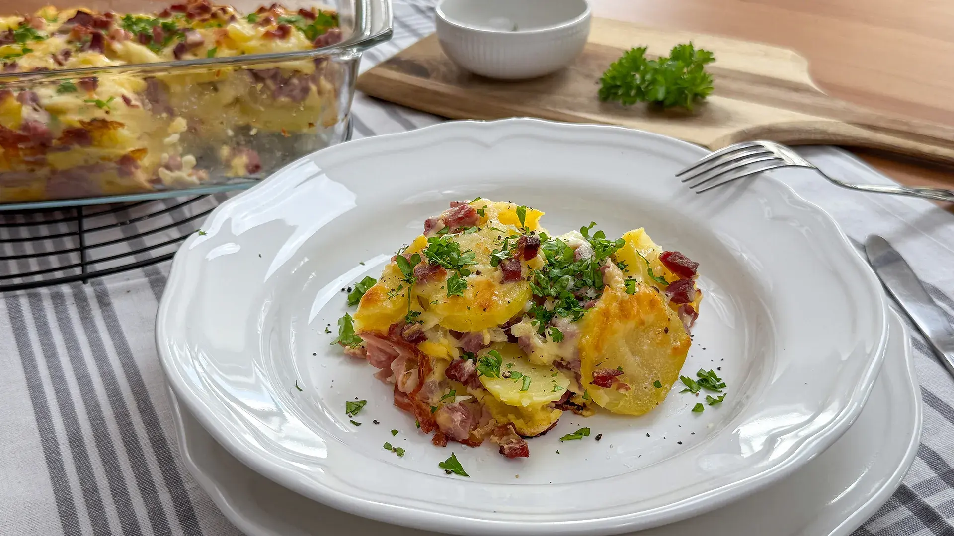 Ingredience: 1 kg neloupaných brambor, 300 g šunky v celku, 1 cibule, 200 g tvrdého sýra, 4 vejce, 200 ml smetany na vaření, 1 lžíce pšeničné hladké mouky, sůl, mletý pepř, 1 špetka drceného kmínu, 100 g slaniny nakrájené na plátky, hladkolistá petrželka