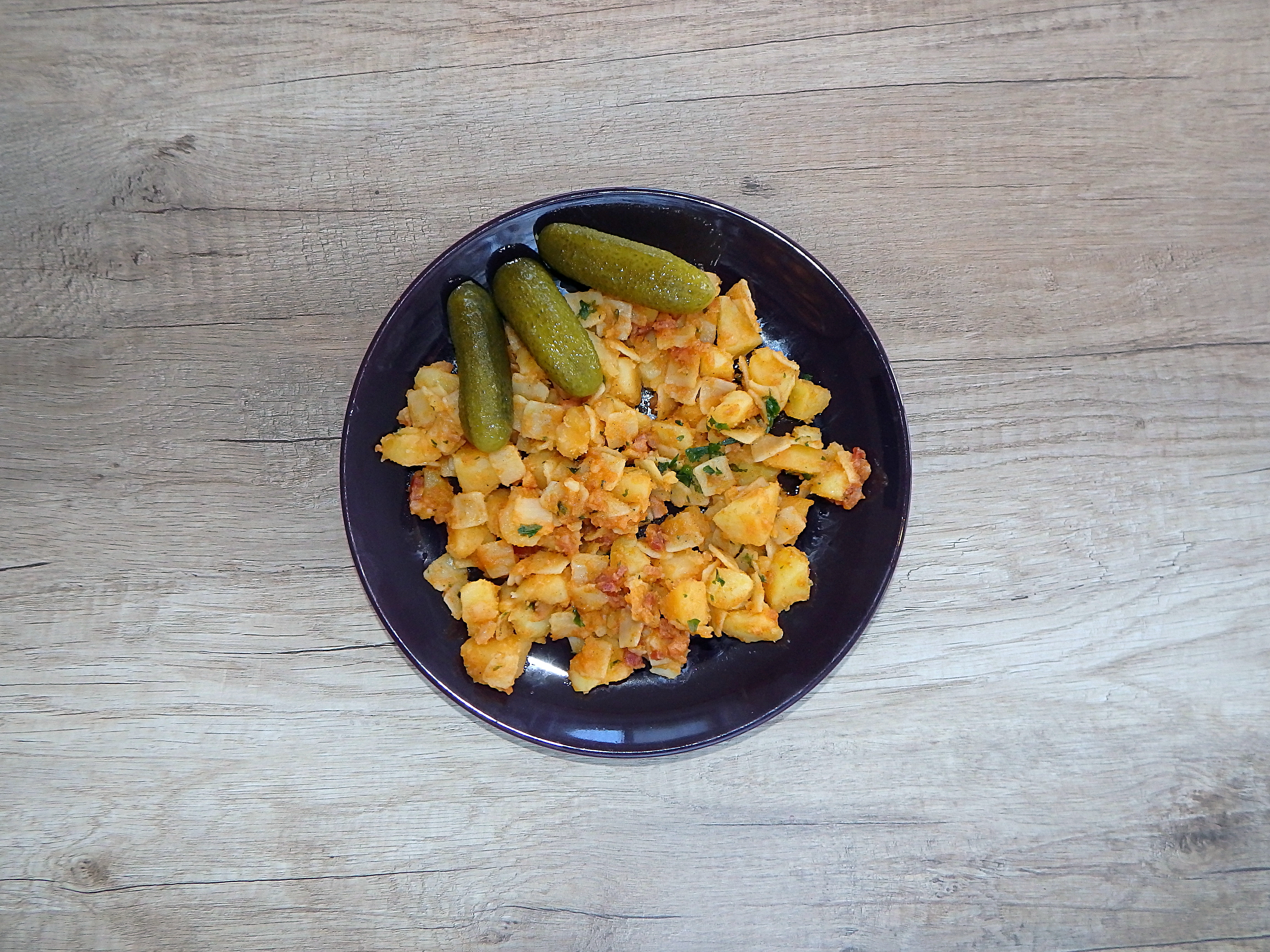 - Brambory: Vařte je doměkka ve slupce, nechejte vychladnout, oloupejte a rozšťouchejte, případně nakrájejte na menší kousky.