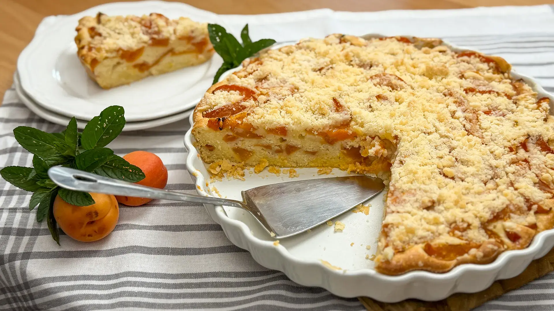 - S rozmarýnem pro gurmánský efekt: Chcete-li koláč posunout do sofistikovanější roviny, přidejte do drobenky špetku nasekaného čerstvého rozmarýnu – jeho aroma zvýrazní chuť meruněk.