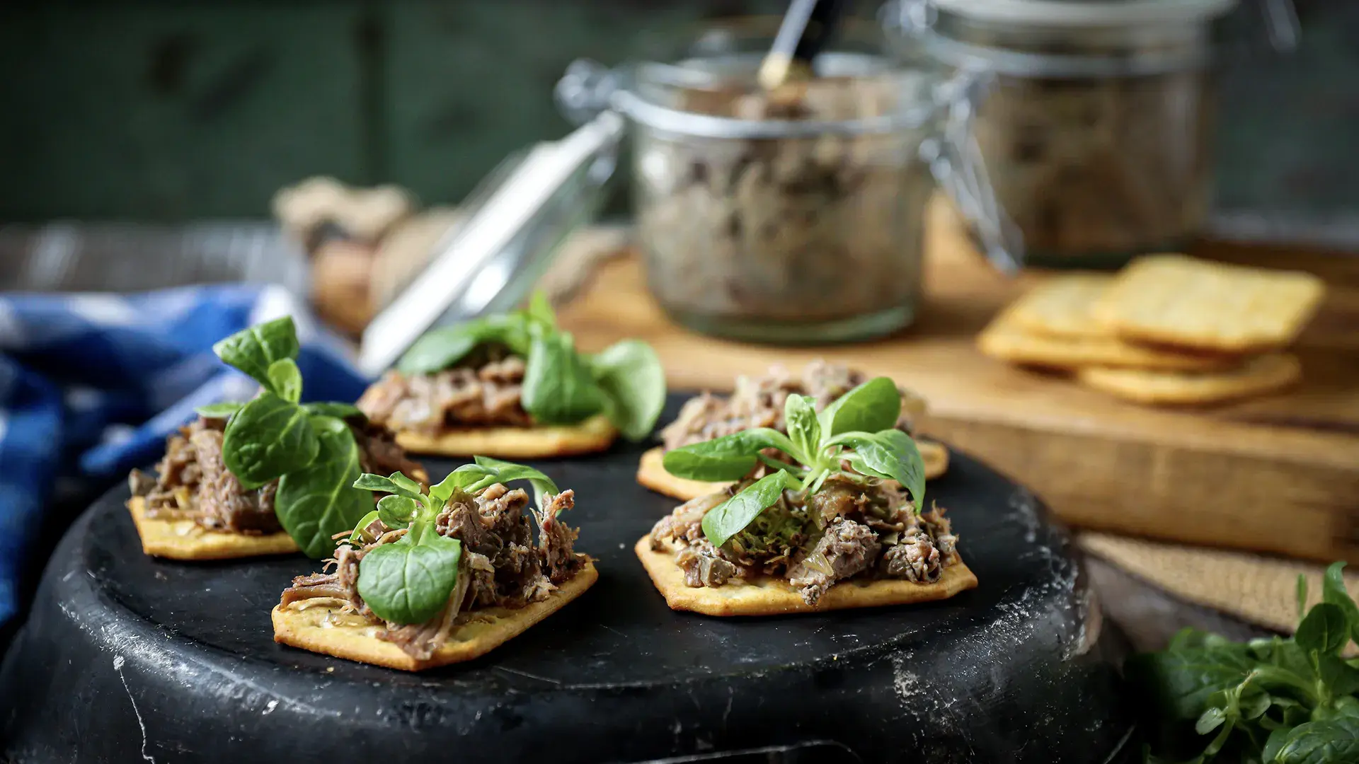 Husí paštika à la rillettes se připravuje z pečeného masa a jater, která se rozvoní na sádle s cibulí, česnekem a kořením. Chuť se krásně rozvíjí hlavně po několika hodinách odpočinku v chladu, kdy se suroviny dokonale propojí a vytvoří bohatý, chuťově vyvážený celek.