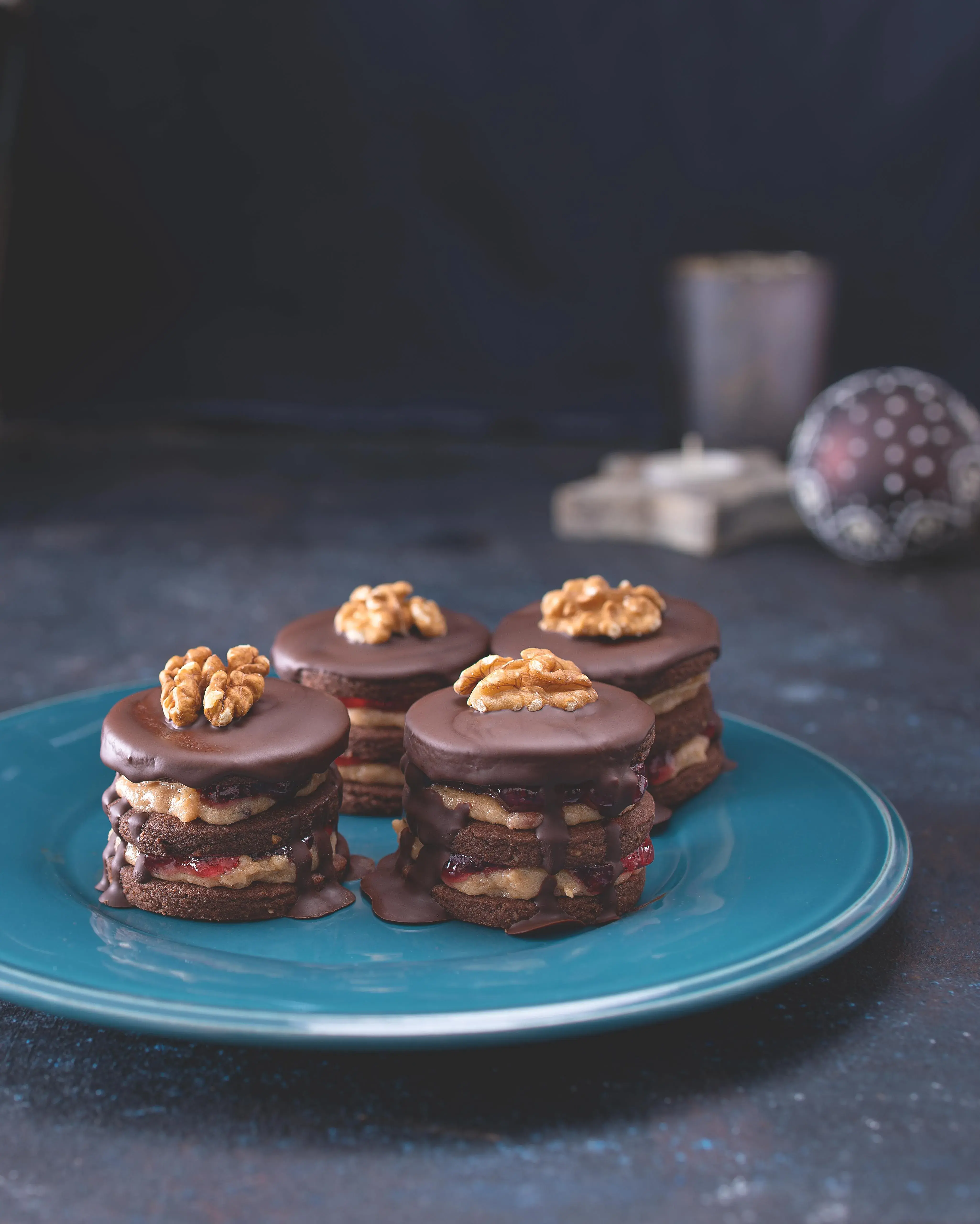 - Nakonec namočte vršek cukroví do rozehřáté čokoládové polevy, ozdobte půlkami vlašských ořechů a nechte dobře ztuhnout.