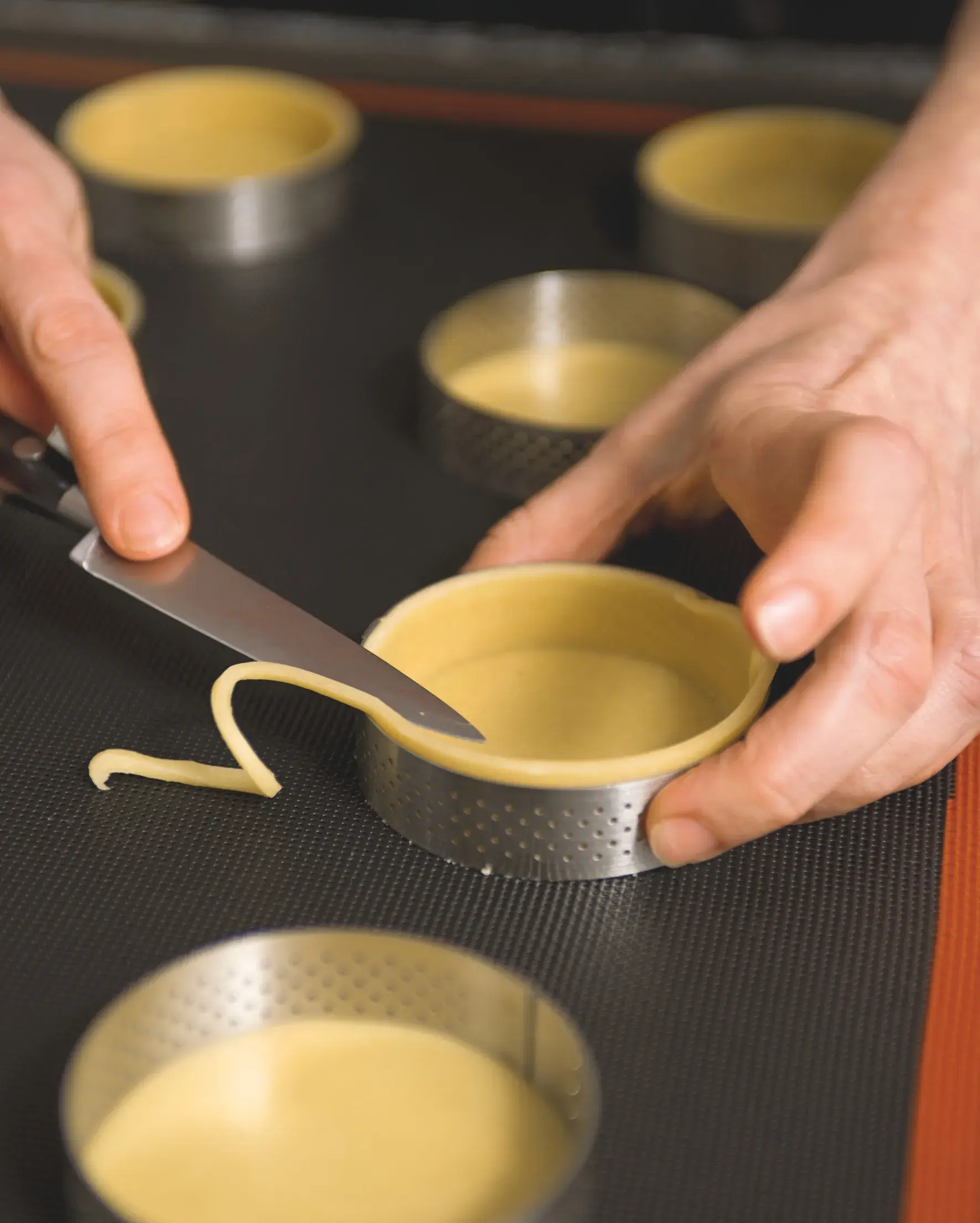 S křehkým těstem pracujte rychle! Nejdůležitější je správné zpracování těsta na pracovní ploše. Těsto vysypte z mísy, shrňte do oválu nebo kupičky a hranou dlaně postupně odhrnujte od sebe. Potom těsto srolujte směrem k sobě, otočte o 90° a proces jednou či dvakrát zopakujte. Tomuto procesu se říká frezáž. Těsto zpracovávejte co nejrychleji a pouze do té doby, kdy je spojené. A hlavně opravdu žádné hnětení.