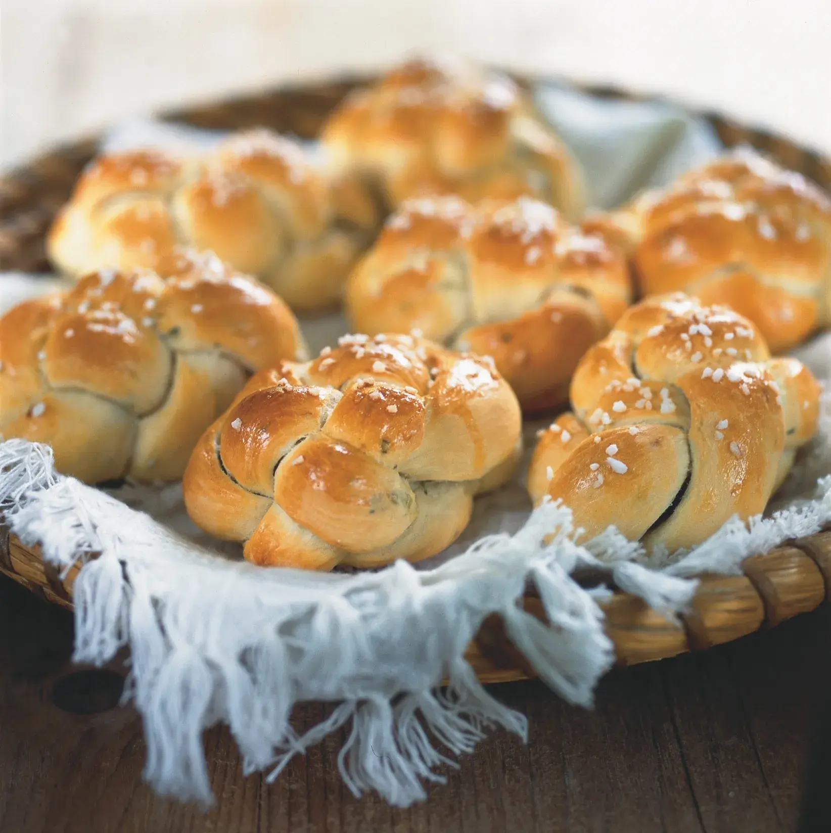 Vezměte si dostatečně velkou bulku a vyválejte z ní asi 30 cm dlouhý pramen. Vytvořte oko tak, že pravý okraj pramene přiložíte zhruba ke středu. Volný konec pramene protáhněte vzniklým okem shora (dovnitř oka). Oko pak přetočte doprava. Volný konec pramene protáhněte svrchu dospod (dovnitř oka).