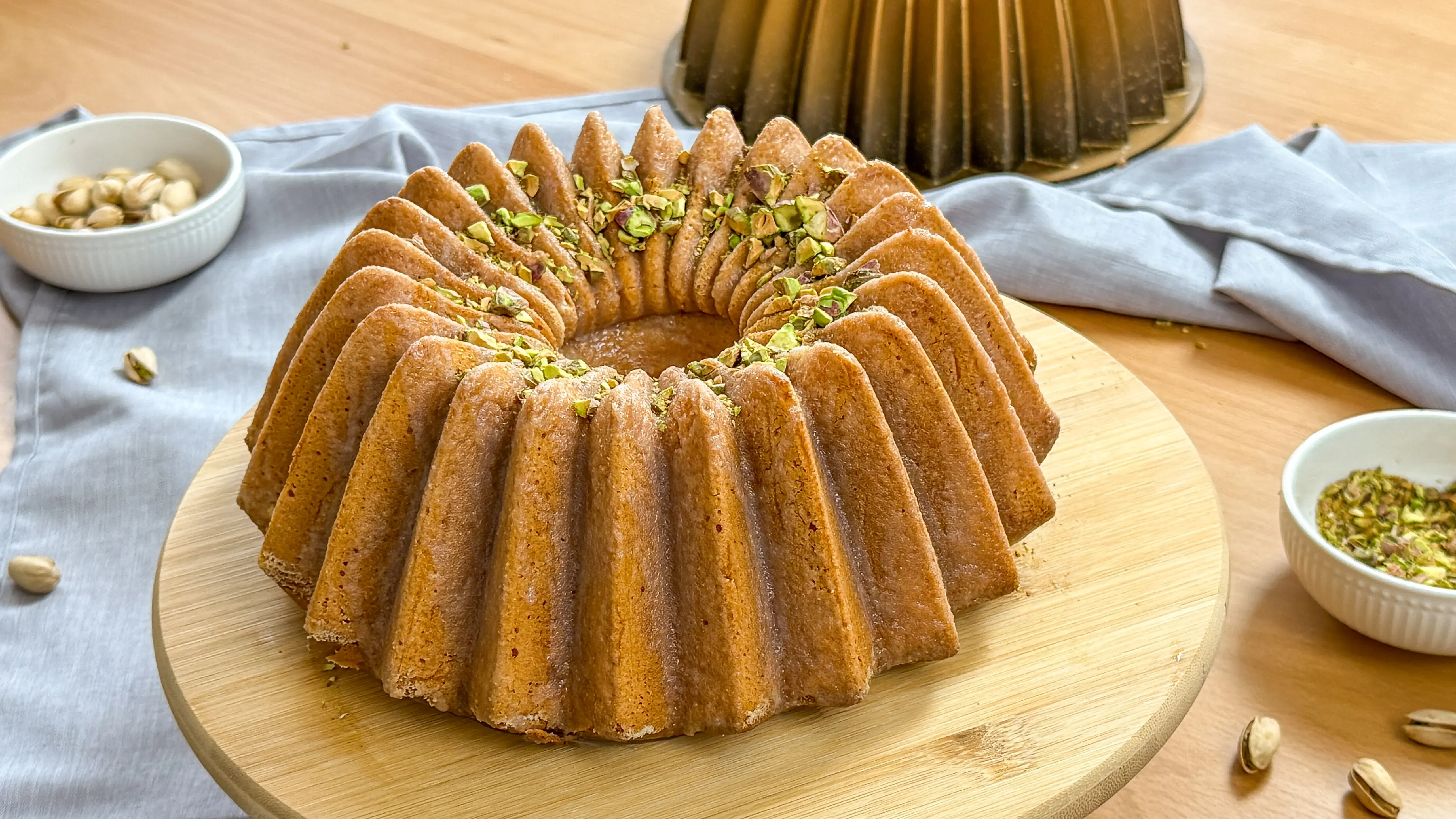 Na první pohled klasika, po ochutnání ohromující jemná citronová vůně a dokonale nadýchané těsto. K tomu pistácie na povrchu a lehce nakyslá poleva, která se vpíjí do horkého korpusu. Tato bábovka se na vašem stole moc neohřeje – je to vláčná domácí delikatesa, která si říká o další a další ochutnání.
