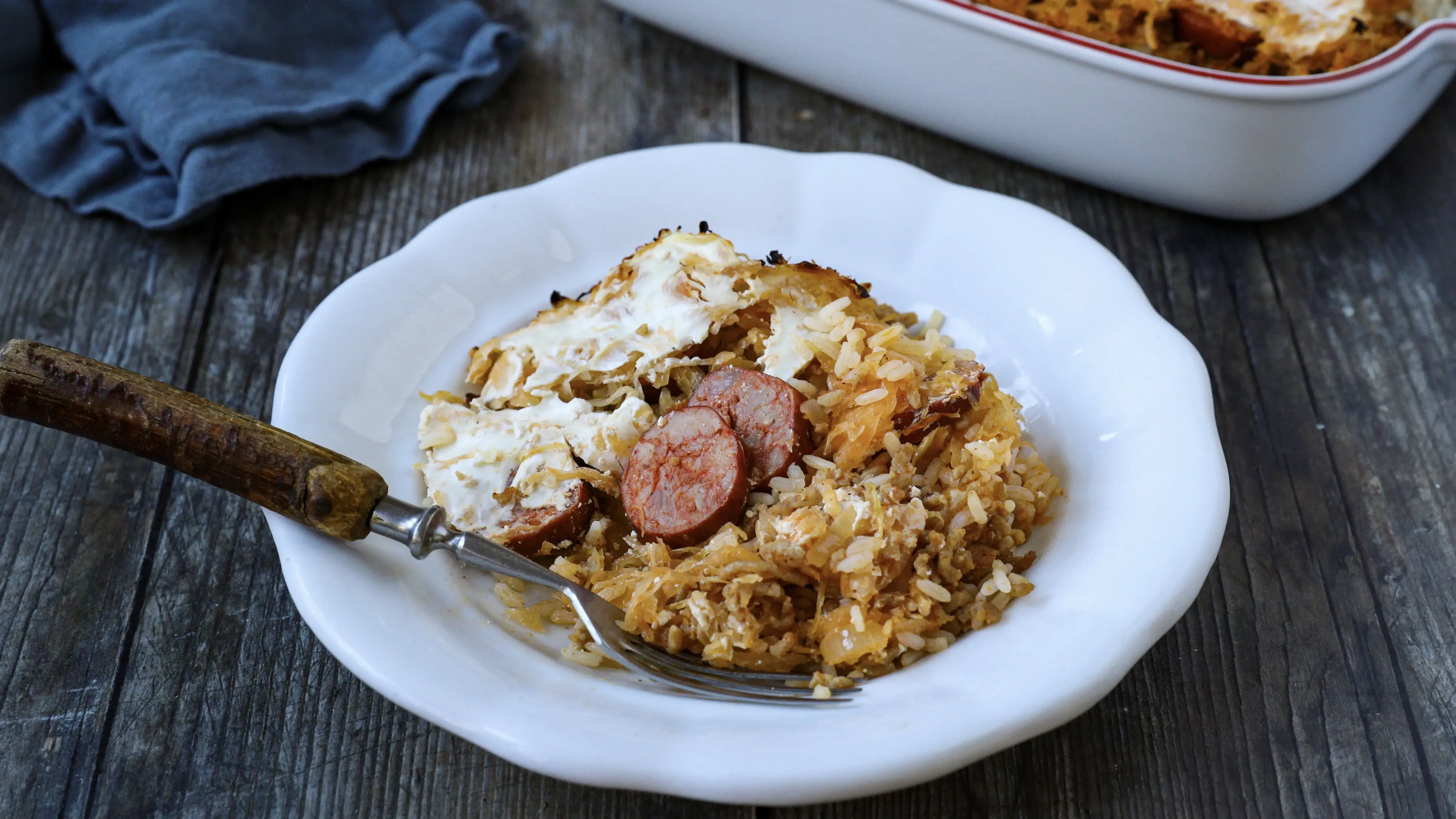Tento tradiční pokrm spojuje jemně pikantní maso s kysaným zelím, rýží a zakysanou smetanou, výsledkem je plnohodnotné a syté jídlo vhodné pro rodinný oběd i vydatnější večeři.
