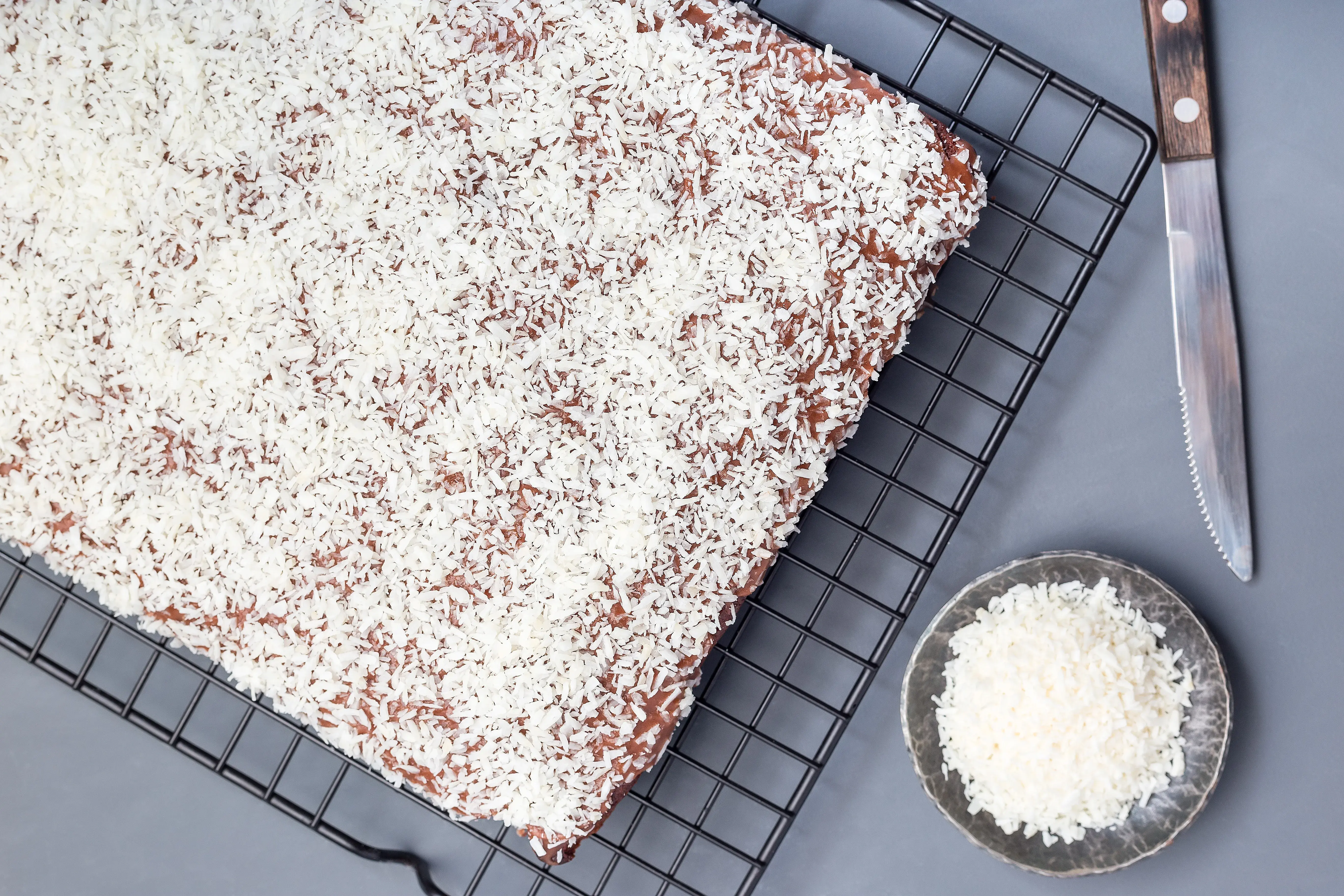 - Dokončení: Polevu nalijte na vychladlý moučník a posypte nastrouhaným kokosem.