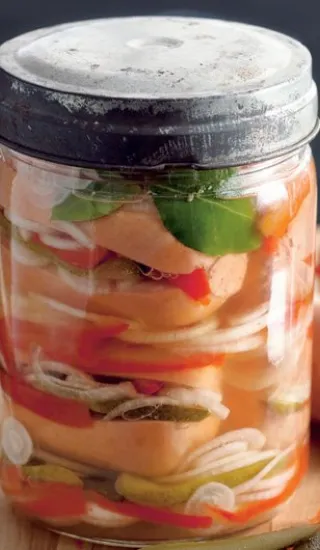 Na nálev: 200 ml octa, špetka cukru, 1 lžička soli, 2 bobkové listy, 2 lžičky celého pepře, 1 lžička nového koření, 1 sušená feferonka