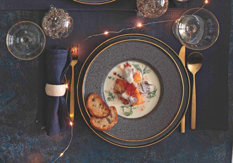 - Do polévkových talířů vložte plátky čerstvého lososa a tresky a přelijte je smetanovým vývarem s bramborami a mrkví.