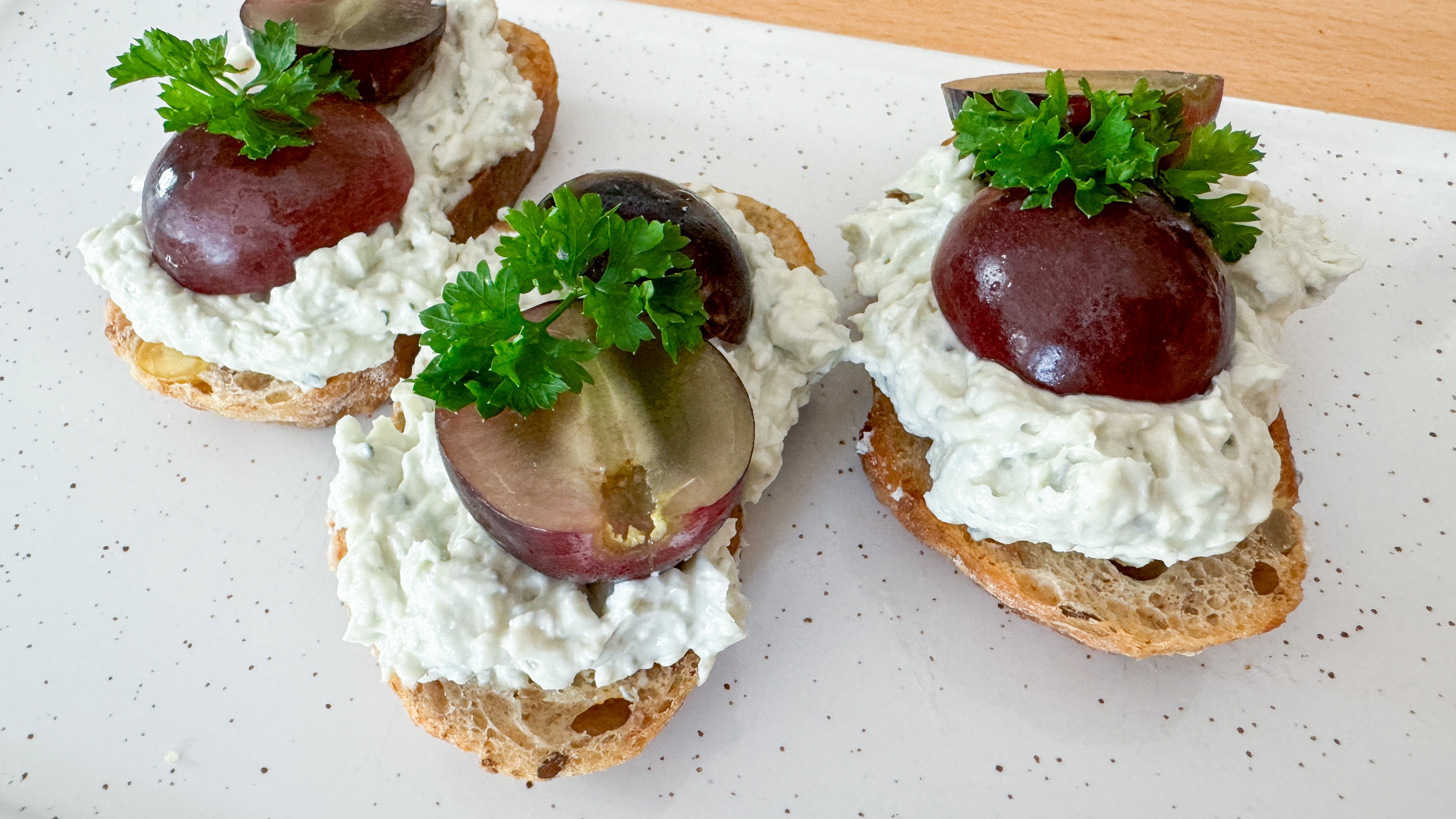 - Pomazánku podávejte namazanou na pečivu a ozdobte rozpůlenými kuličkami hroznového vína.