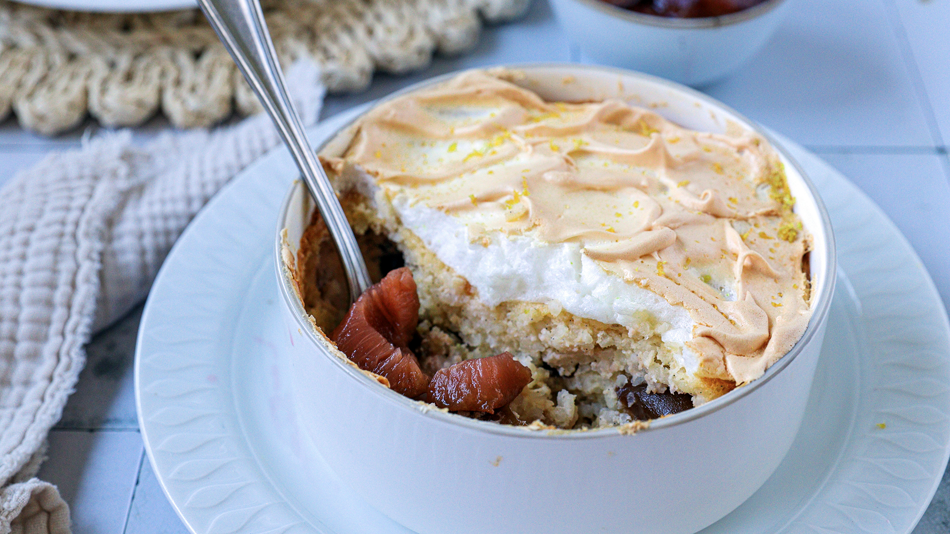 - Pečte 35 minut (nebo dokud nebude povrch pevný), pak na nákyp navršte zbylý sníh, vraťte do trouby a dopékejte ještě 15 minut do zezlátnutí.