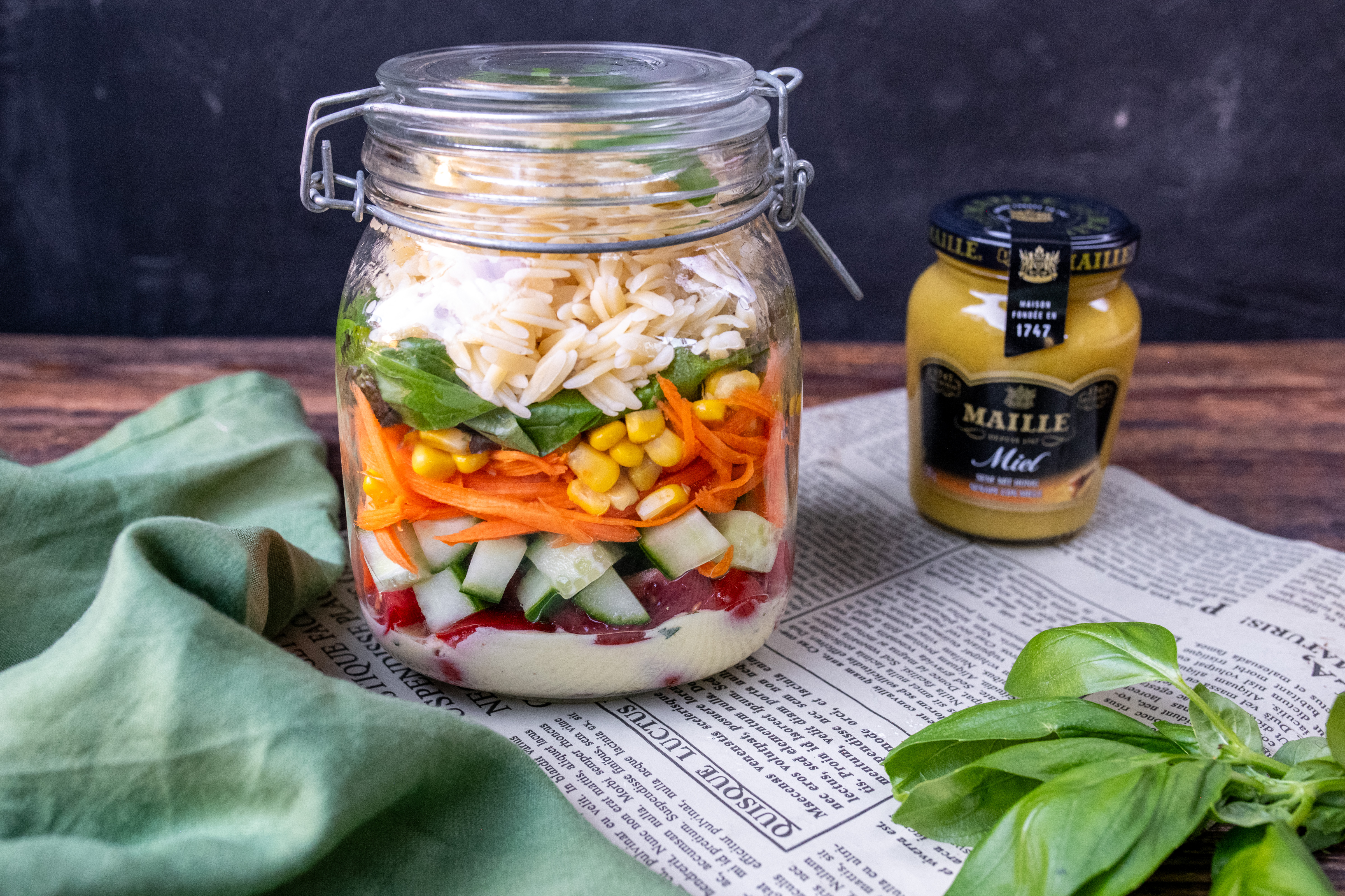 Na dno sklenice patří dresink. Zvolit můžete kombinaci dijonské hořčice Maille a medu nebo zakysané smetany, skvělý bude balzamikový ocet s olivovým olejem, domácí majolka s bílým vinným octem a bylinkami nebo třeba tzatziki.