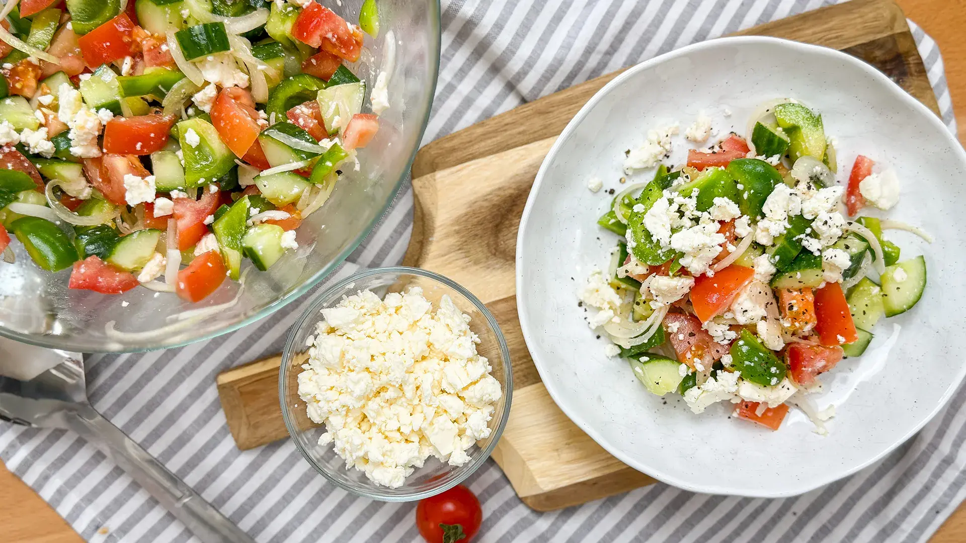 Ingredience: 300 g rajčat, 1 salátová okurka, 250 g zelené papriky, 1 cibule, 3 lžíce slunečnicového oleje, citronová šťáva podle chuti, 1 špetka soli, 1 špetka mletého pepře, balkánský sýr