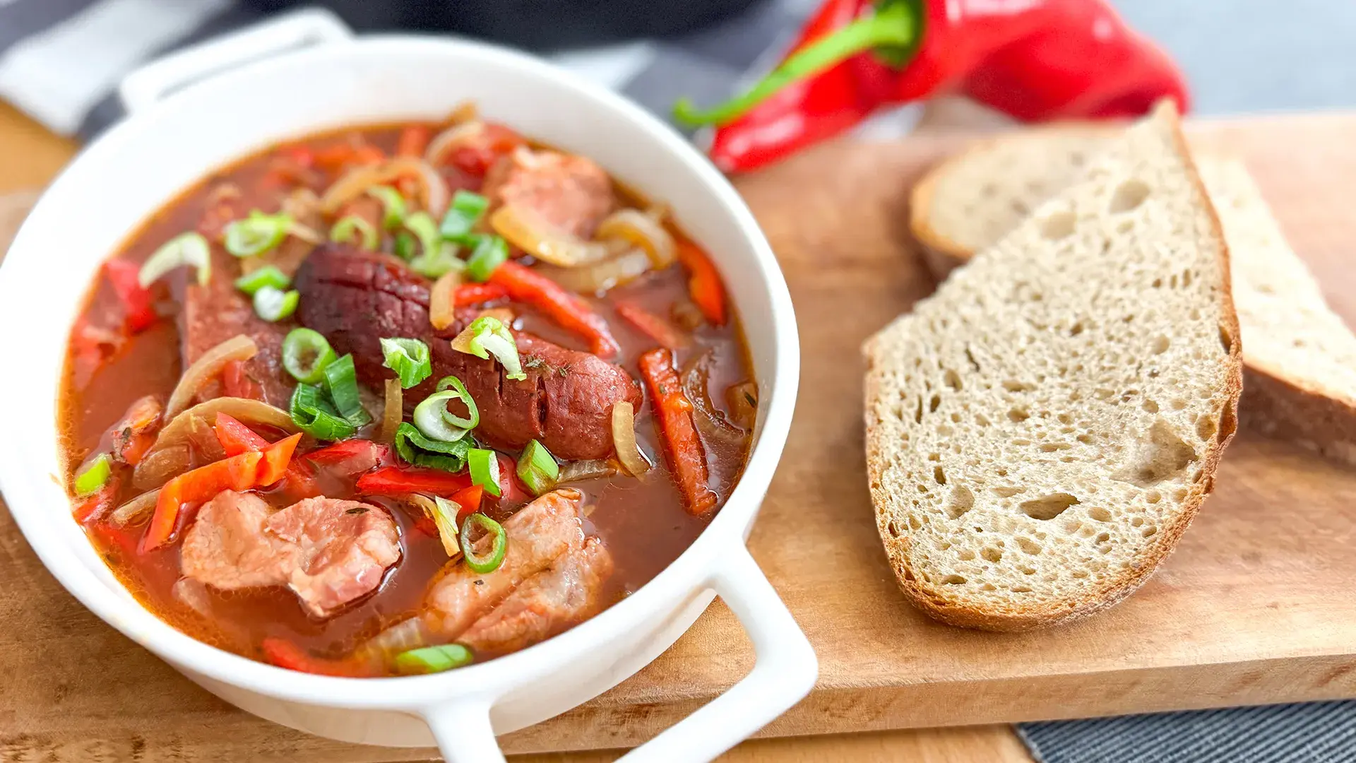 Ingredience: 800 g krkovice, 4 špekáčky, rostlinný olej na opékání, 4 cibule, 250 g rajčatového pyré (nebo passaty), 400 g konzervovaných loupaných rajčat, 2 lžíce sladké mleté papriky, 1 špetka kajenského pepře, 3 lžíce medu, 2 snítky čerstvého tymiánu, 4 stroužky česneku, 2 bobkové listy, 1 l tmavého piva, 200 g papriky kapie, chleba k podávání