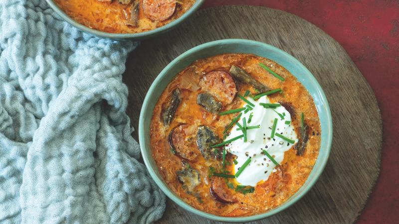 Ingredience: 1 hrst sušených hub, 3 brambory, sůl, mletý pepř, 600 g kysaného zelí, 3 klobásky, 3 lžíce sádla, 1 cibule, 3 lžíce sladké mleté papriky, 1 lžíce pšeničné hladké mouky, 200 g zakysané smetany + k podávání, 2 stroužky česneku, pažitka na ozdobení