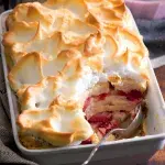 - Příprava sněhu a dokončení: Během pečení ušlehejte pevný sníh z bílků a 6 lžic cukru. Poté, co se žemlovka dopeče, rozetřete na ni sníh a ještě 5–8 minut zapékejte.
