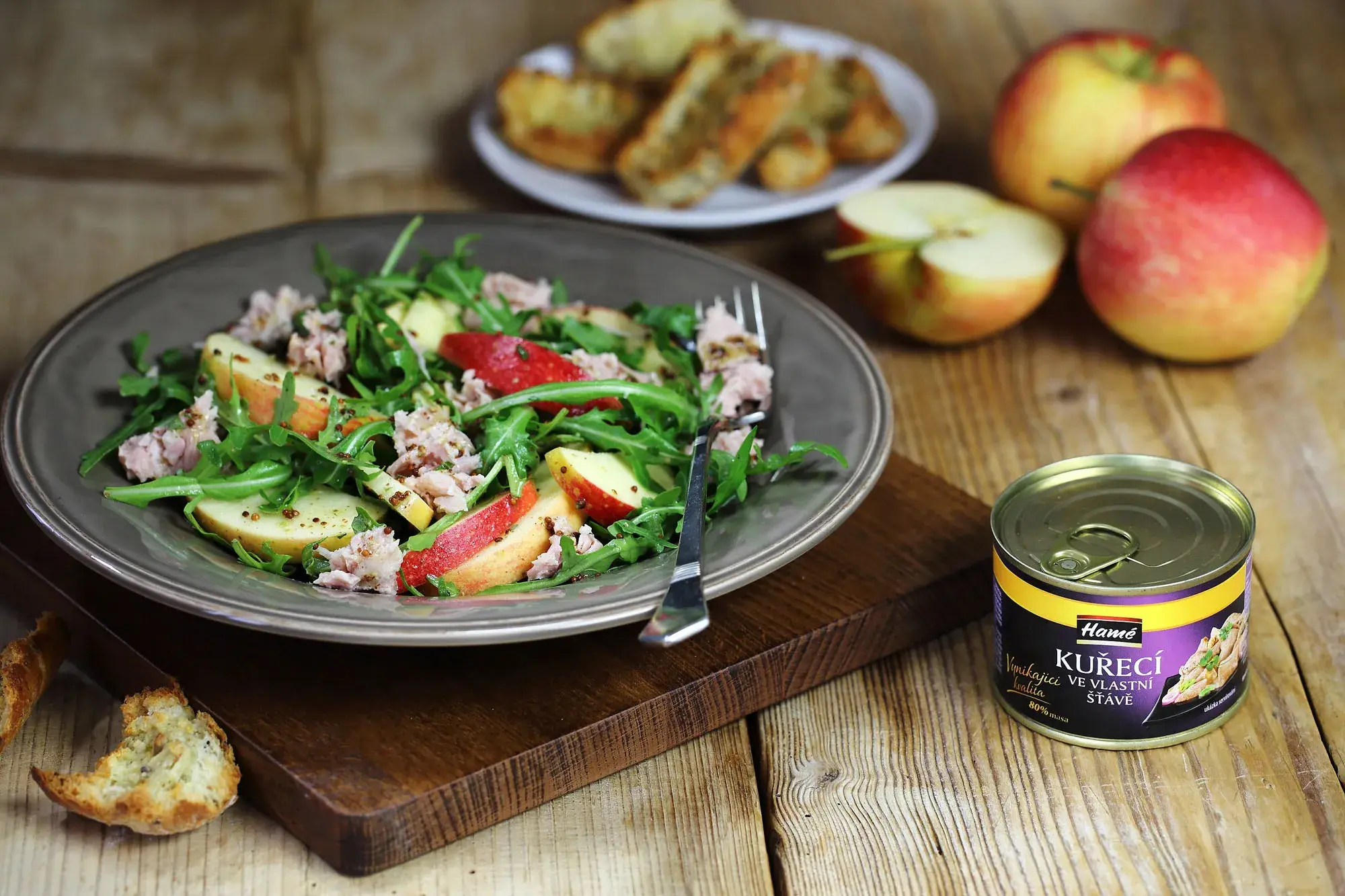 1 Jablka zbavte jádřince a nakrájejte na menší kousky. Zakápněte je citronem, aby v salátu nehnědla. Z kuřecího masa Hamé odeberte ztuhlou šťávu a pak maso rozdělte po vláknech. Hořčici, olej a citronovou šťávu prošlehejte na dresink. Přidejte trochu čerstvě mletého pepře pro aroma a nakonec zamíchejte i nasekanou petrželku. Všechno smíchejte v salátové míse s opranou rukolou a zalijte dresinkem.