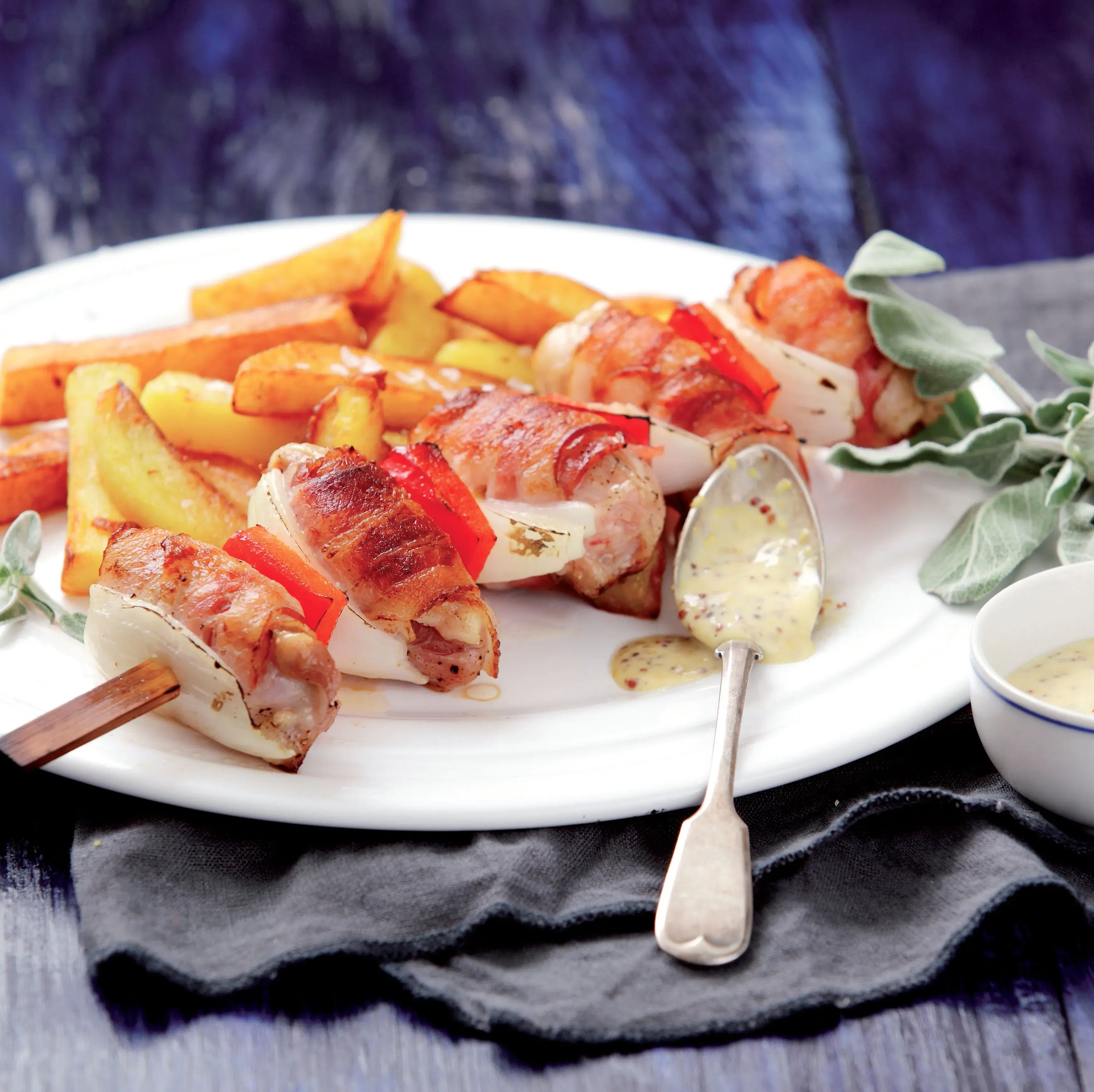 3 Kuřecí stehýnka nakrájíme na kostky velké tak 3 × 3 cm. Kostky vložíme do mísy, osolíme, opepříme, pokapeme olejem a promícháme. Špejle namočíme na 10 minut do studené vody. Papriku nakrájíme na větší kostičky, cibuli na měsíčky. Kousky kuřecího masa zabalíme do plátků anglické slaniny a napícháme spolu s paprikou a cibulí na špejle. Pečeme v předehřáté troubě na režim Horký vzduch s párou 230 °C, čas 15–20 minut.