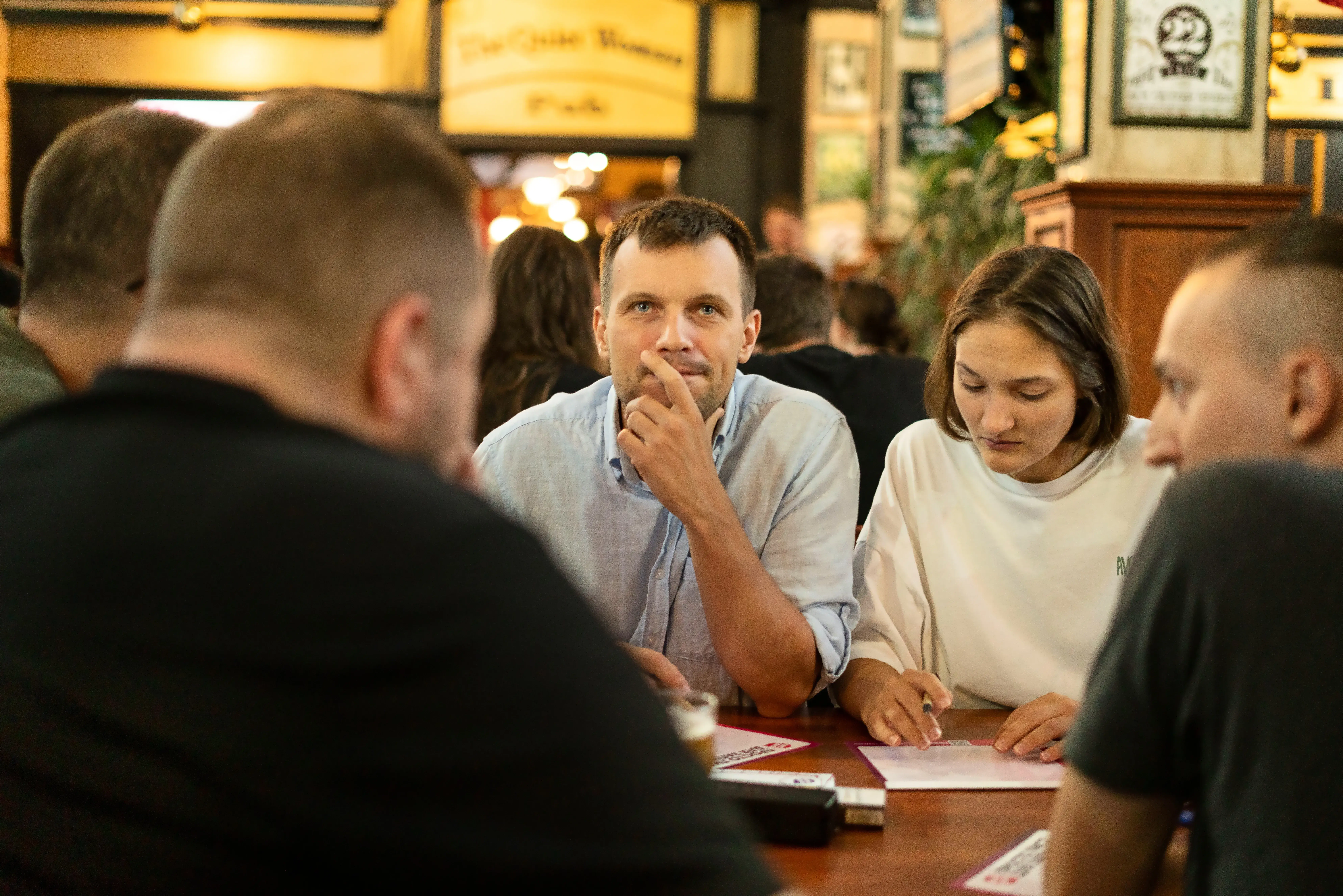 Po každém kole následuje krátká pauza, během které si můžete objednat další občerstvení, zatímco se sčítají body. Atmosféra je jedinečná – je to směs soutěživosti, smíchu, taktizování a (nevinného) napětí, když celý tým hádá správnou odpověď. Nikdy nevíte, co vás čeká: jednou můžete přemýšlet o největším sýru na světě, jindy se vás moderátor zeptá na český termín pro zahraniční pokrm.