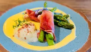 - Uvařený chřest naservírujte na talíř, přidejte pošírované vejce, přelijte holandskou omáčkou a přidejte parmskou šunku.
