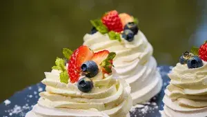 Ingredience: 130 g bílků pokojové teploty, špetka soli, 210 g cukru krupice, vanilka, 1 lžička vinného octa, 1 lžíce kukuřičného škrobu, smetana na šlehání, sezonní ovoce