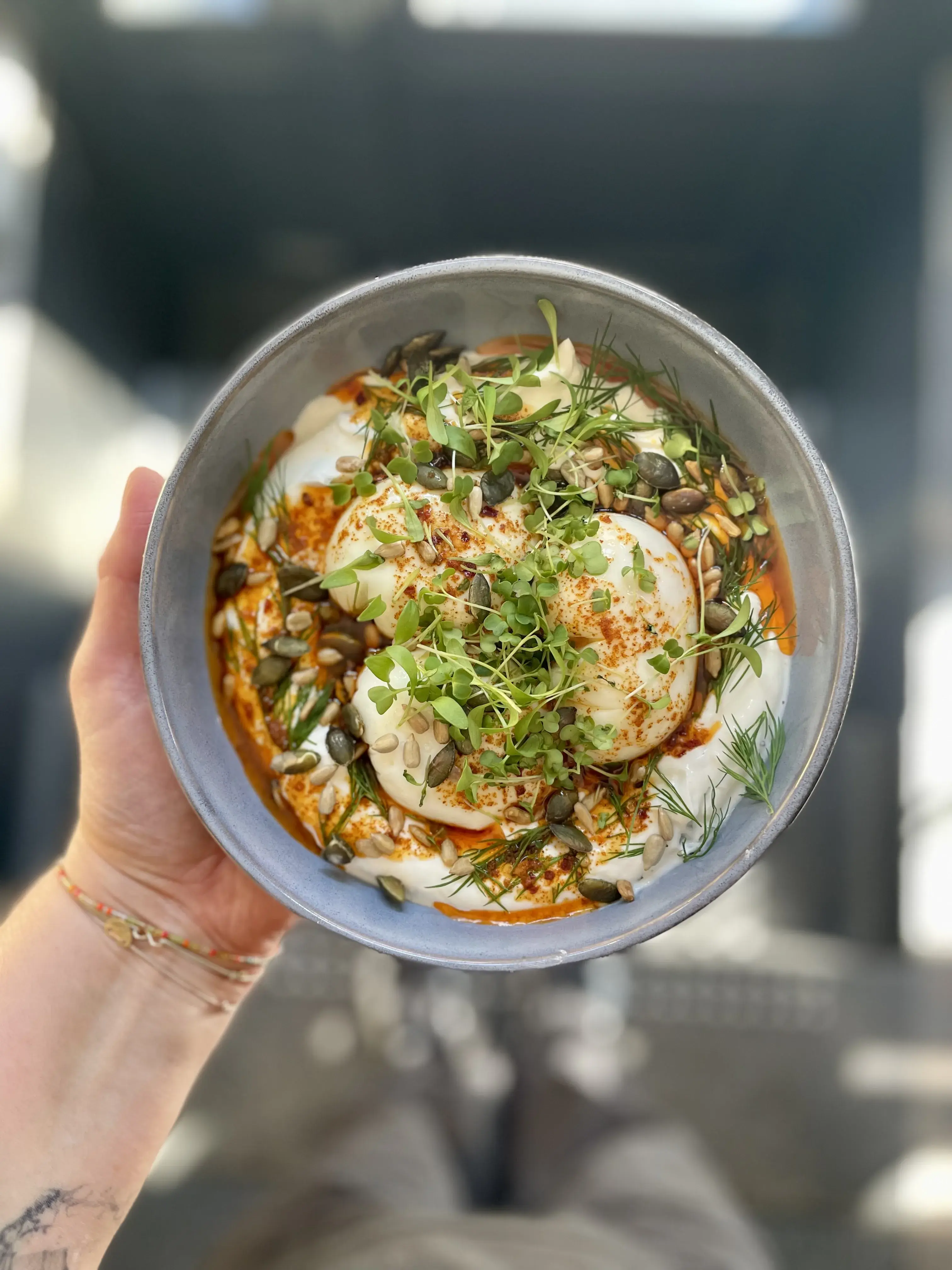 Na 2 porce budete potřebovat: 1 hrst máty, 1 hrst kopru, 1 stroužek česneku, 200 g řeckého jogurtu, 4–6 vajec, 50 g másla, 1 lžičku drcených chilli papriček, 1 lžičku uzené papriky, opražená dýňová a slunečnicová semínka, mikrobylinky, sůl, pečivo k podávání