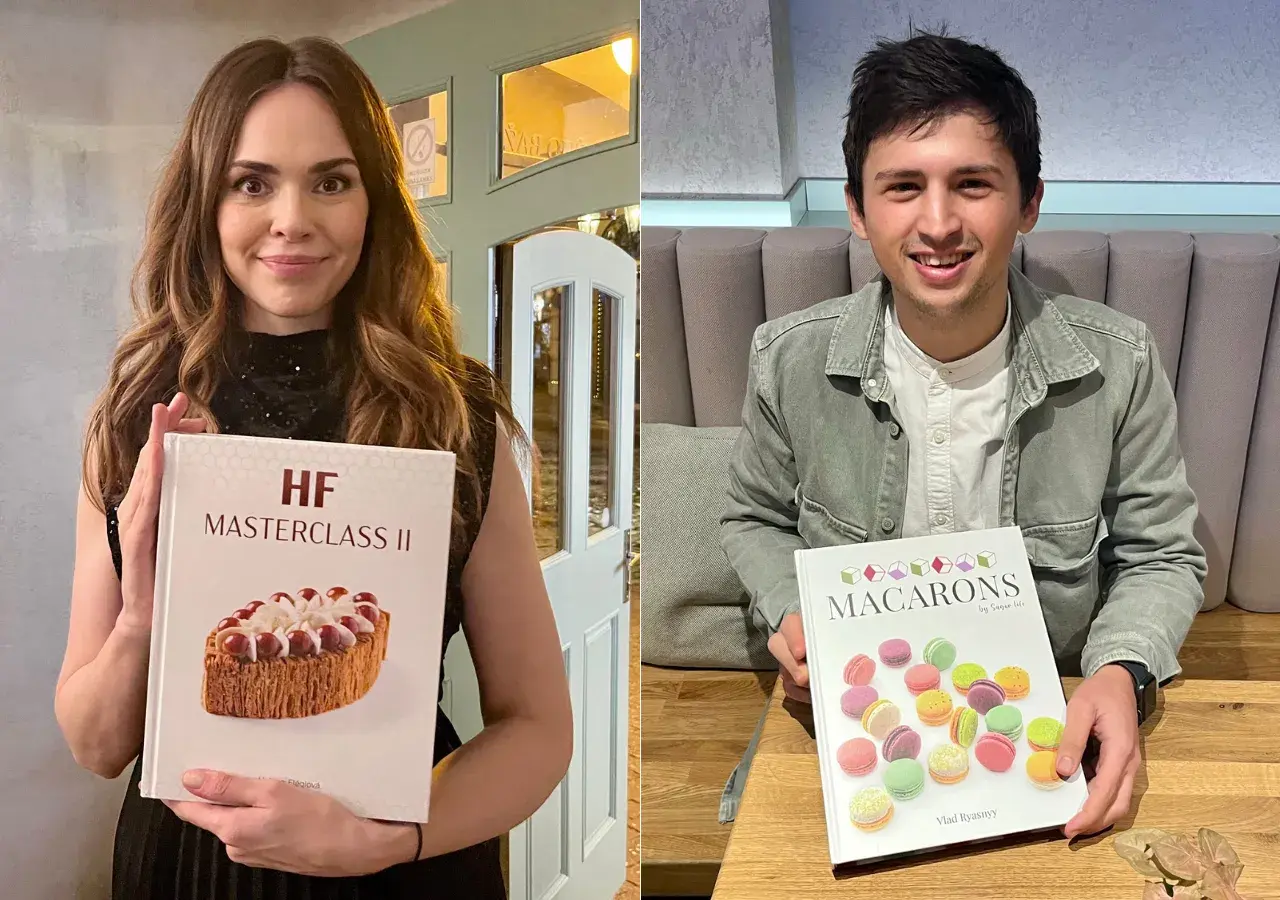- Helena představila titul nazvaný Masterclass II, Vlad dvojjazyčnou česko-anglickou knihu Macarons, podrobně věnovanou makronkám.