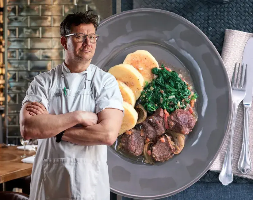 Hovězí na česneku se špenátem a knedlíky není zrovna jídlo, které byste na michelinského šéfkuchaře tipovali. Oldřich Sahajdák však tradiční česká jídla miluje a sám nemá nálepku fine dinning příliš v lásce. Dokonce i svůj podnik Marie B. nazývá hospodou.