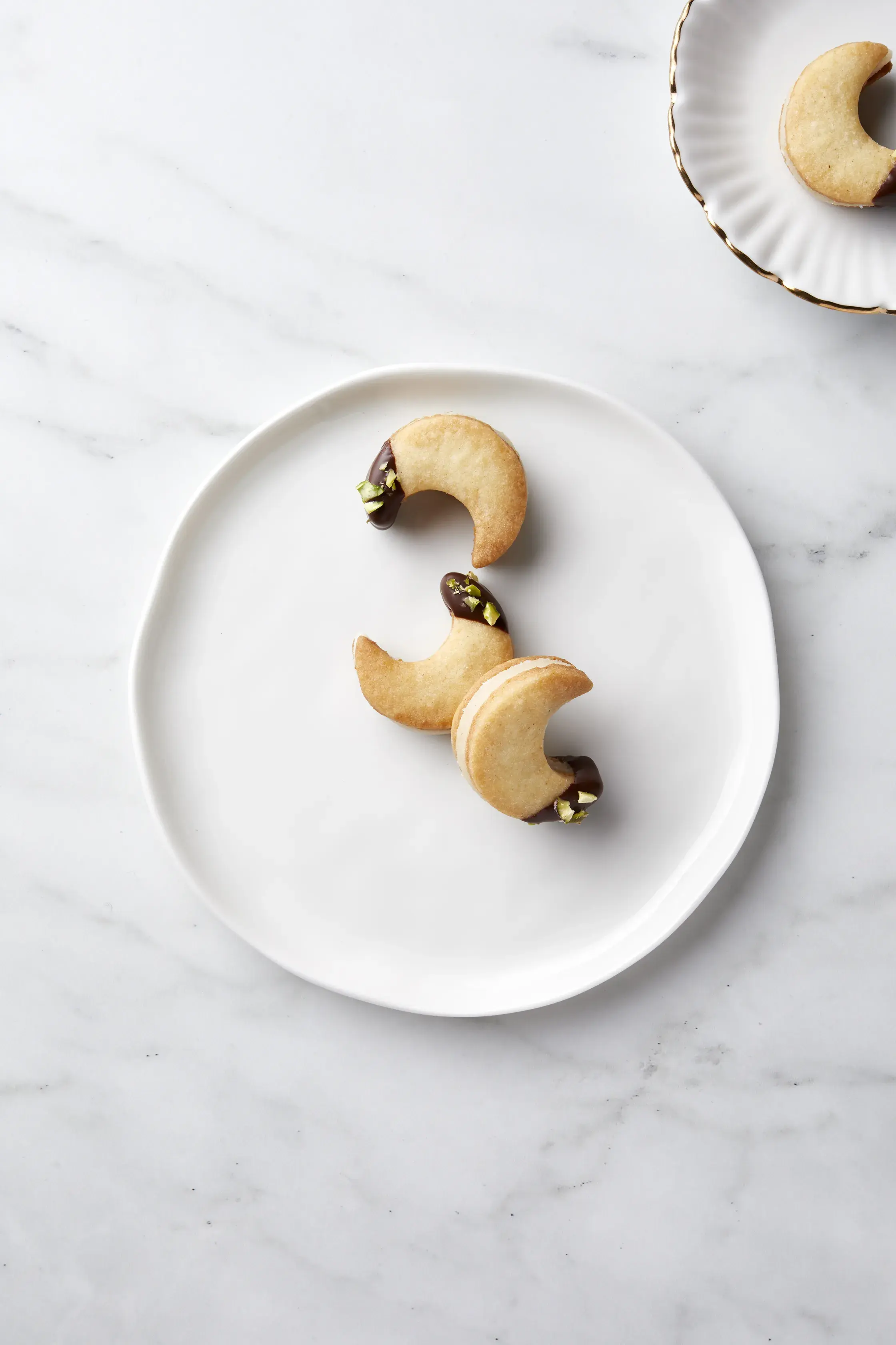 - Špičky měsíčků namočte do připravené polevy. Jakmile poleva zlehka uschne, posypejte ji sekanými pistáciemi.