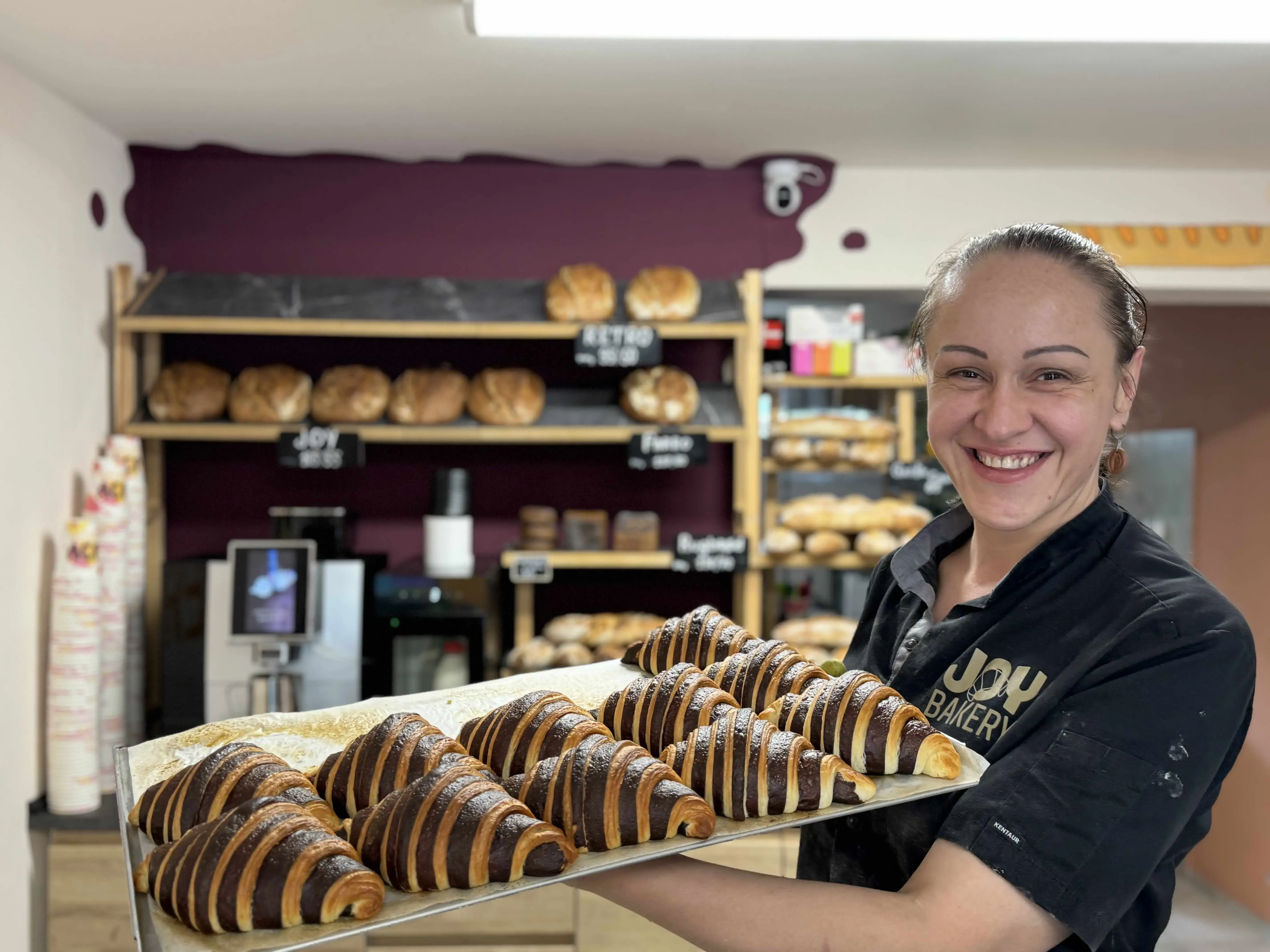 Zákazníci se do Joy Bakery nejvíce vrací za croissanty, které se tady pečou ve dvou variantách. Volit můžete mezi mandlovým croissantem nebo a tím s pistáciovou náplní, kterou si Ludmila také sama vyrábí. Joy Bakery se od řady pekáren liší tím, že se na proces výroby můžete podívat. V malé prodejně je totiž po pravé straně prosklená místnost, kde se peče. Ludmila zaměstnává brigádnice různých národností, takže v Joy Bakery uslyšíte nejvíce angličtinu.