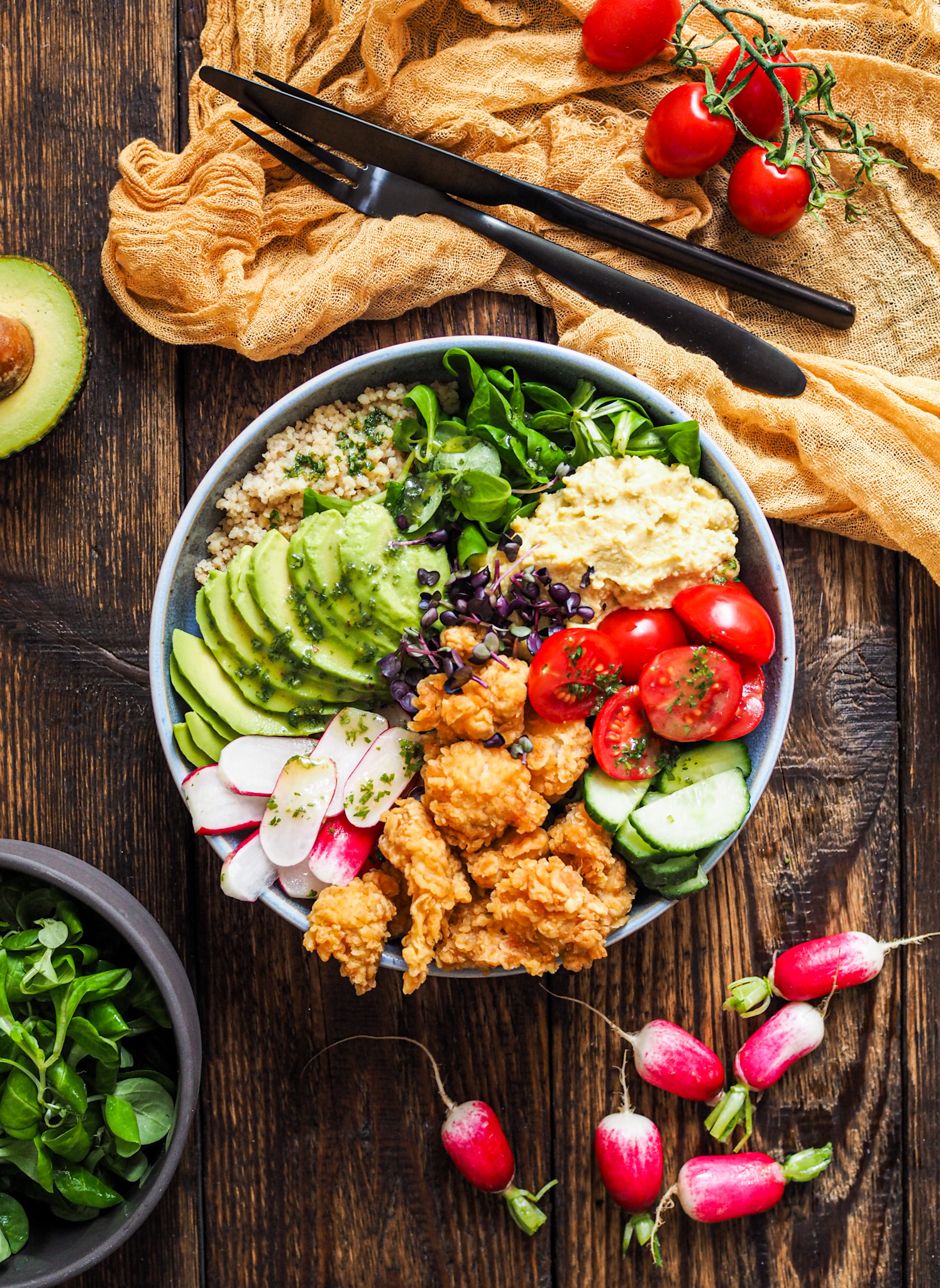 Ingredience na bowl: 150 g opečených kuřecích kousků nebo stripsů, 100 g uvařeného kuskusu, ½ avokáda, hrst polníčku, 4 cherry rajčata, 2 ředkvičky, ¼ salátové okurky, 3 lžíce hummusu