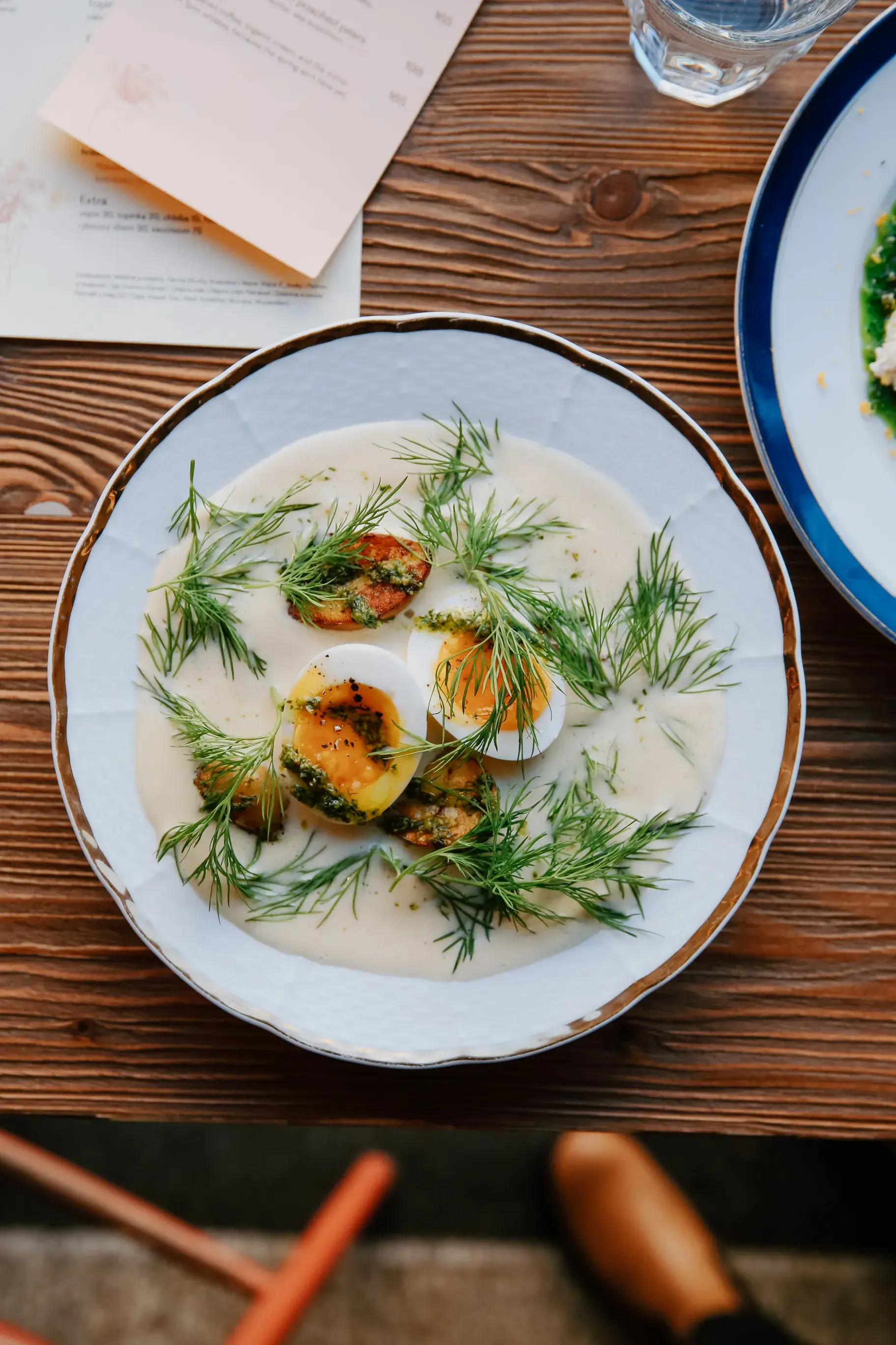 Na ozdobu: vejce vařené 6,5 minuty, naložené lišky a čerstvý kopr