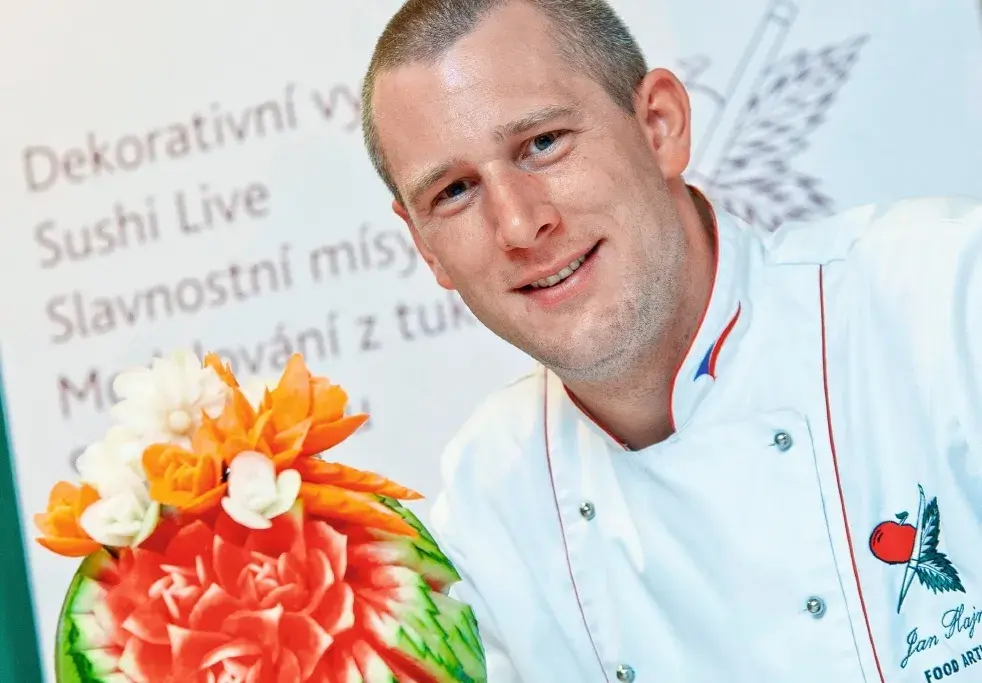 ‚Často slýchám, že takovou krásu je škoda sníst, ale já říkám, že větší škoda je ji nechat shnít,‘ říká s úsměvem kuchař Jan Hajný, jehož specializací je vyřezávání do zeleniny a ovoce a také tvorba soch z tuků či ledu.