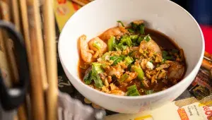 Tomáš: Jak říká Tinni, základem je rýže, k tomu nějaký vývar, vietnamské bylinky, nakládaná zelenina, pečené maso a různé omáčky na namáčení, k tomu si hosté vybírají hlavní chody, které chtějí. Je tu vždy bezmasá varianta, drůbež, hovězí, vepřové, ryby nebo mořské plody. Každý chod má jinou úpravu a liší se profilem chutí. Vše je laděno tak, aby byla hostina co nejpestřejší, a neobjednává si jednotlivec, ale celý stůl.